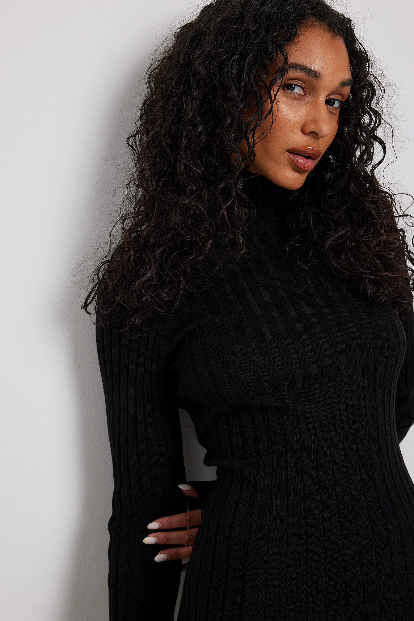 Cette robe courte est tricotée, à nervures, volantée et élastique et a un col haut et des manches longues avec une coupe évasée et épaules rembourrées.