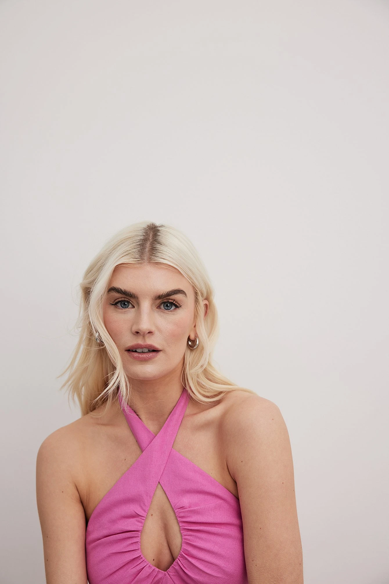 Cette robe midi a un modèle de bretelle à nouer dans le cou avec détail auto-sérré. Elle a un design asymétrique incliné et une fermeture éclair latérale. Cette robe midi a un dos froncé.