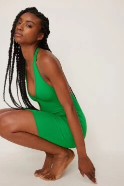 Cette robe courte a une attache de tour de cou, un détail trous sur la poitrine et une matière élastique.