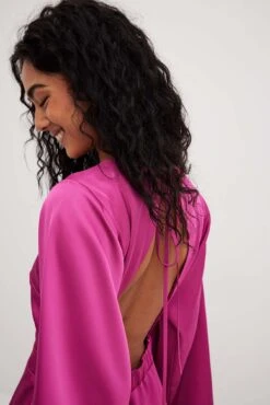Cette robe courte est faite en satin et a une coupe fluide. Elle a une encolure bateau et des manches longues larges. Cette robe courte a un design à dos ouvert en bande élastique avec détail auto-sérré et une fermeture éclair latérale.