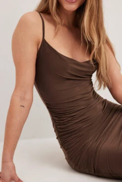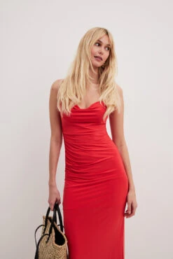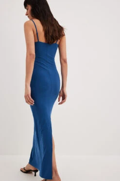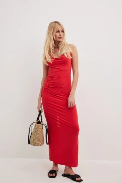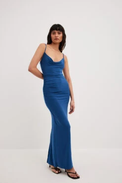 Cette robe longue est drapée et a une matière élastique. Elle a un col boule et des bretelles fines réglables. Cette robe longue a une fente frontale.