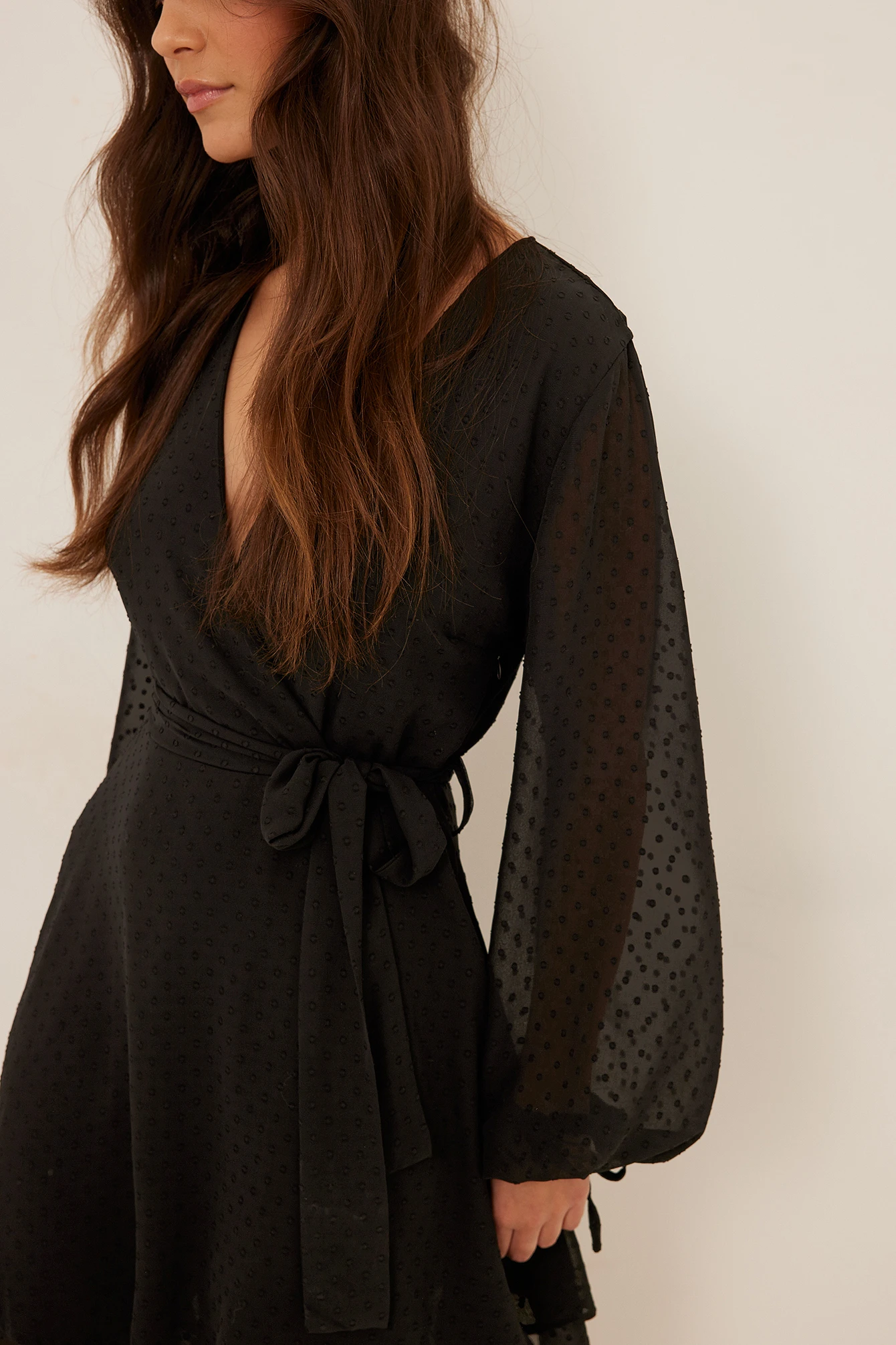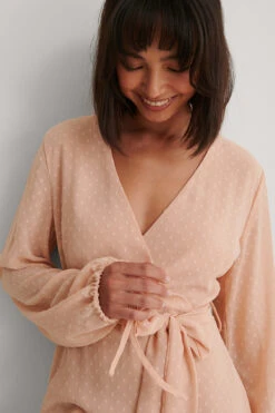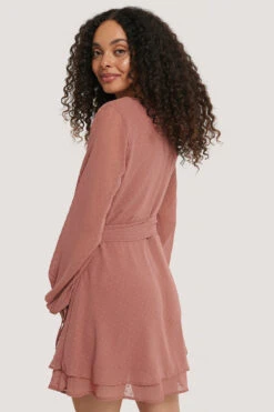 Cette robe courte a un design chevauchant avec un pointillé, des manches longues avec détails auto-sérrés aux manchettes, une ceinture ajustable et une épaisseur ruchée sur l’ourlet.