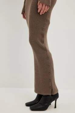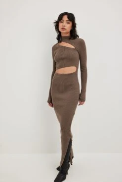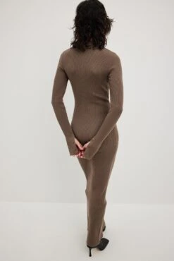 Cette robe longue est en tricot à nervures et élastique et a un col haut. Elle a des détails découpés avec boutons de fermeture et des manches longues avec boutons de fermeture aux bouts. Cette robe longue a une fente latérale avec bouton de fermeture.