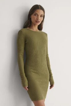 Cette robe a un col arrondi, des épaules tombantes, un design tricoté et une taille courte.