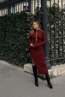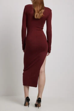 Cette robe longue est tricotée et élastique et a un col haut, des épaulettes, des manches longues avec découpages, des petits détails découpés à l’avant, des ourlets à nervures et une fente latérale.