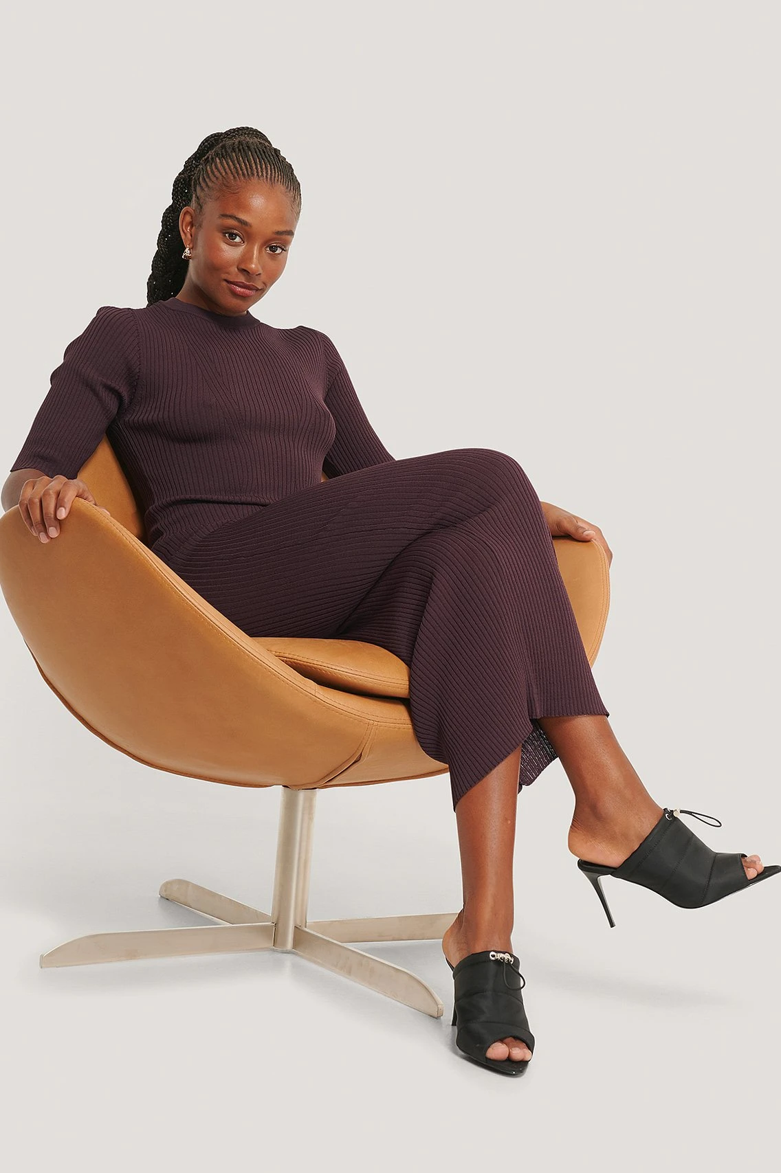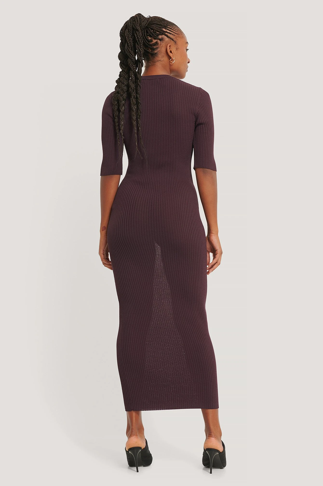 Cette robe midi a un design tricoté à nervures, un col arrondi, des demi-manches et de la forme serrée confortable.