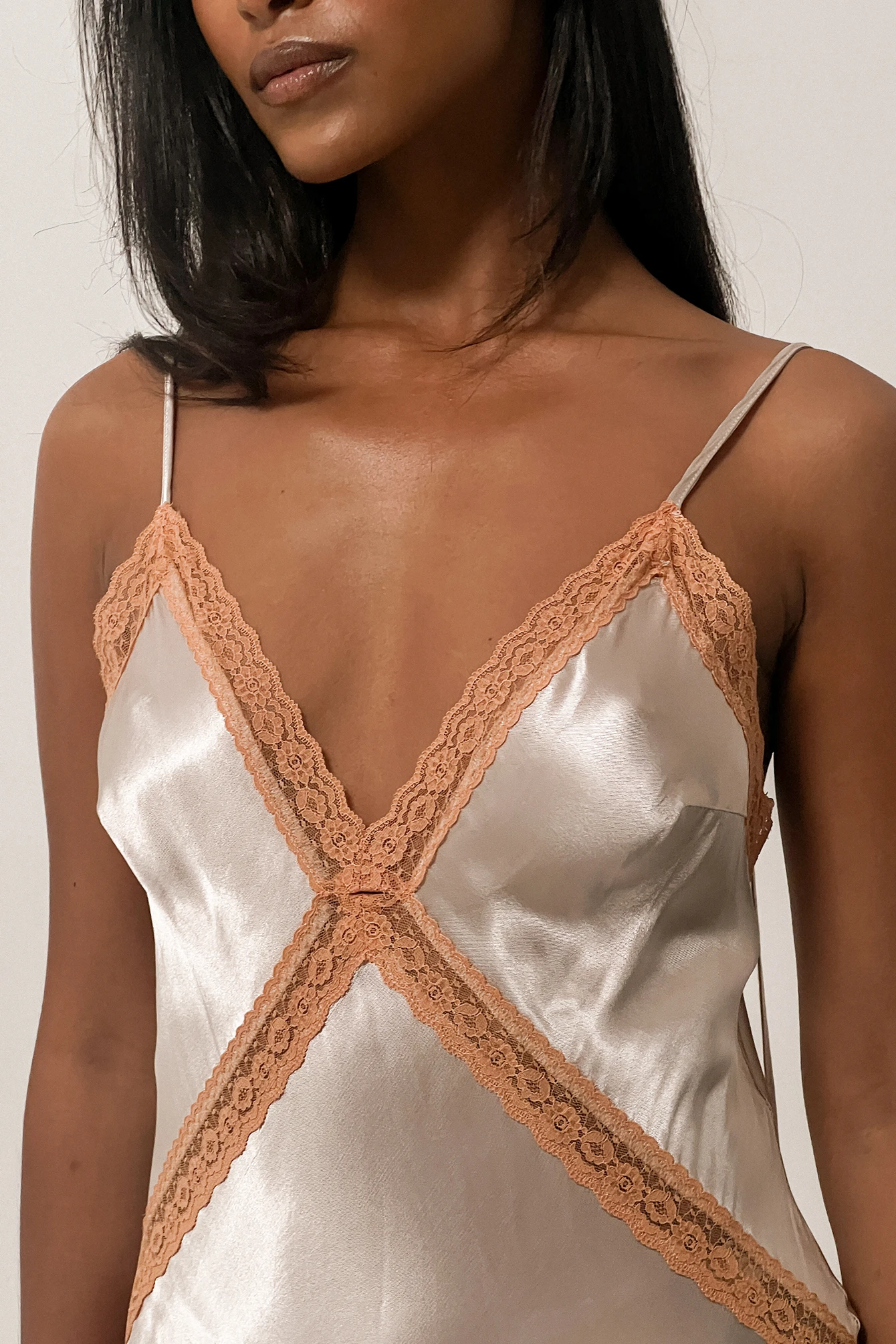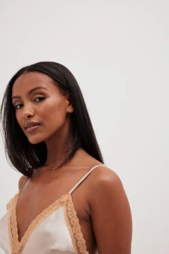 Cette robe a du satin. Elle a des dĂ©tails en dentelle et une coupe ample. Cette robe a un col en V, des bretelles fines rĂ©glables et un dĂ©tail auto-sĂ©rrĂ© Ă l’arrière.