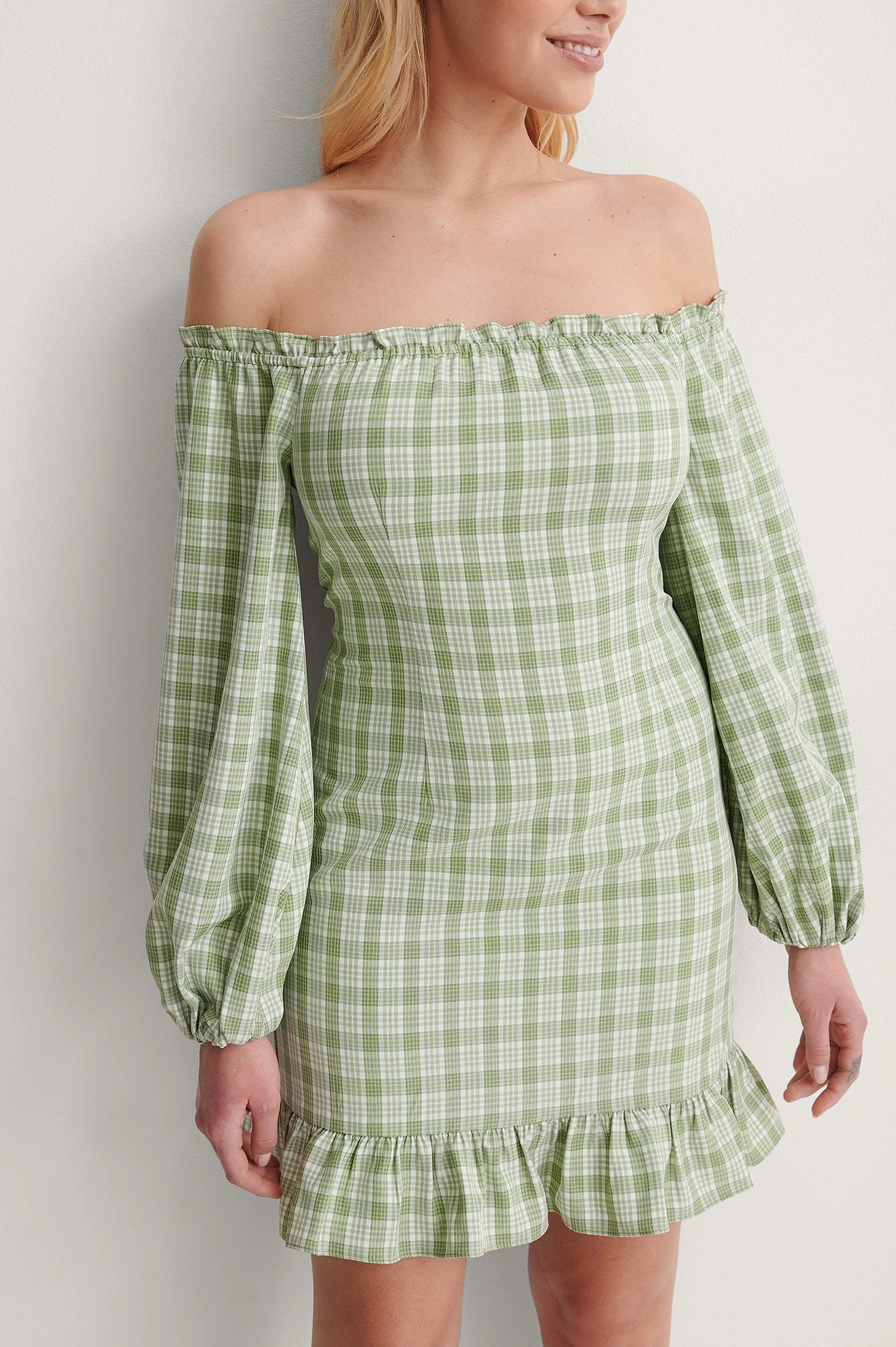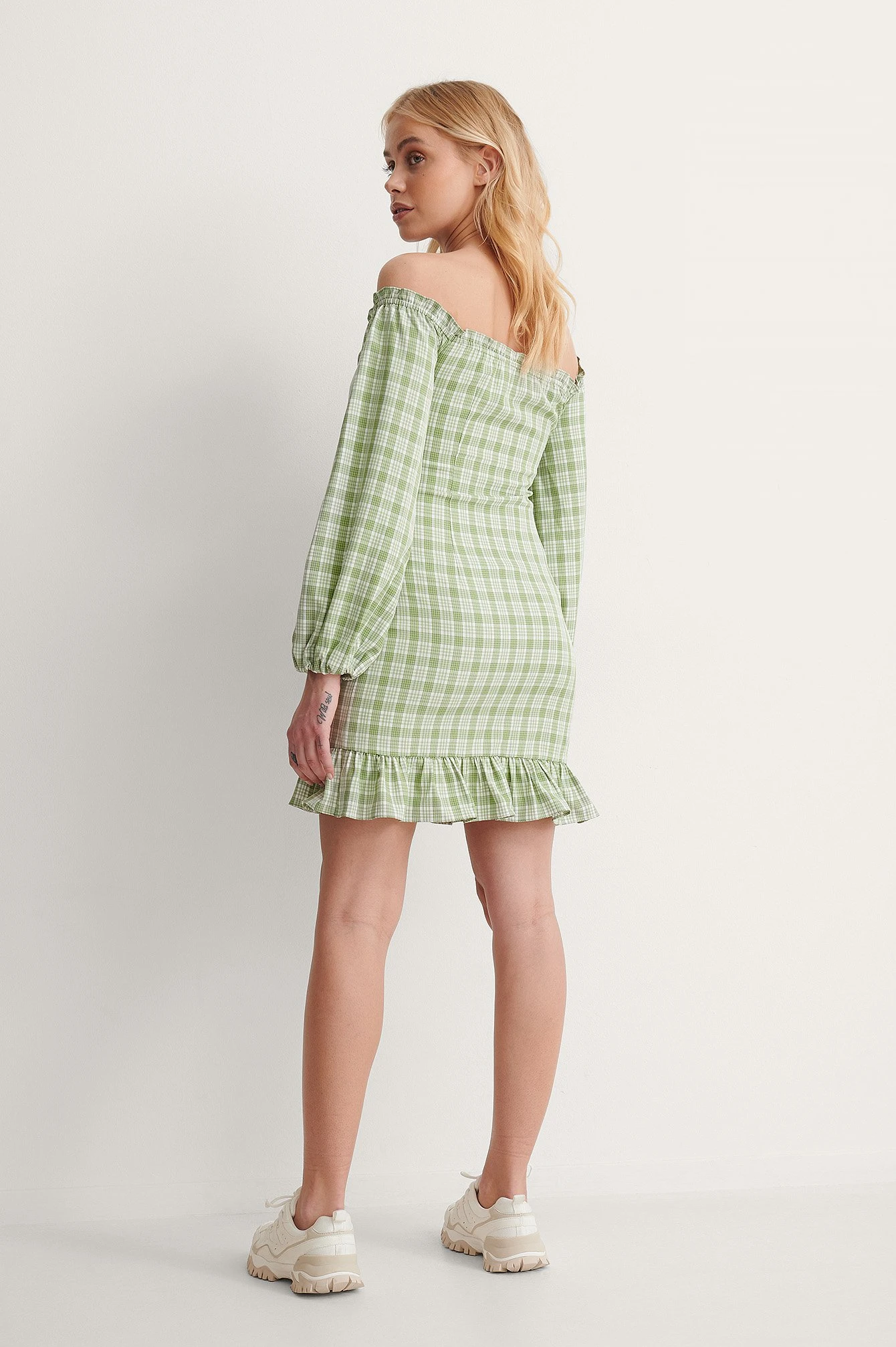 Cette robe a un style à épaules dénudées avec détails à volant, des longues manches avec manchettes élastiques et serrées, une fermeture éclair latérale cachée, une coupe fluide avec détails à volant sur l’ourlet bas, une taille courte et un motif à carreaux.
