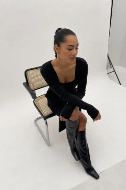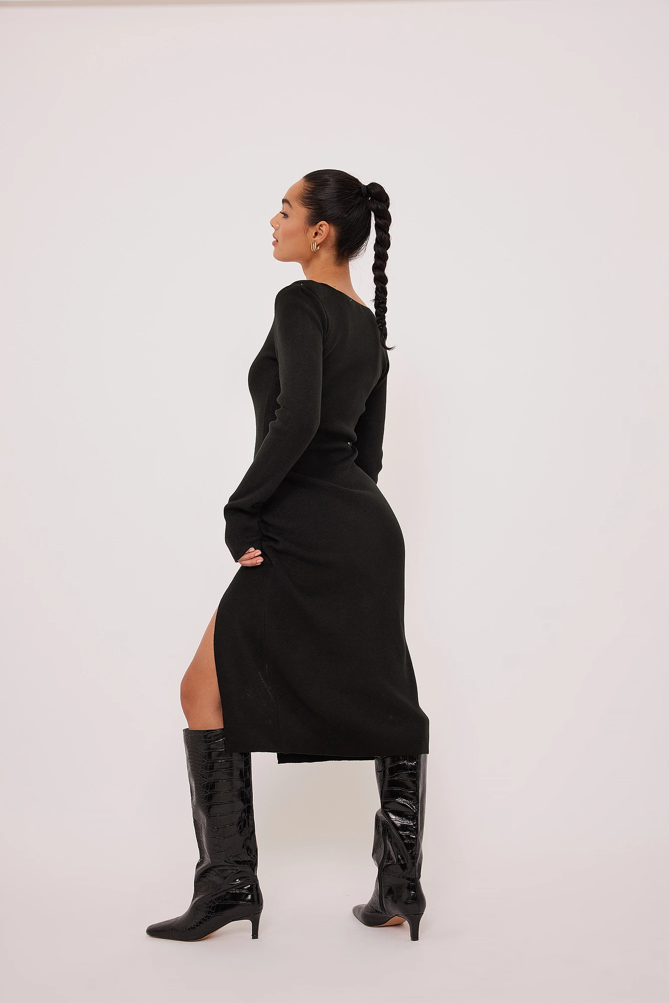 Cette robe longue a un décolleté en coeur, des épaules rembourrées légèrement, des manches longues avec détails fendus aux manchettes, une fente latérale et une matière élastique et tricotée.
