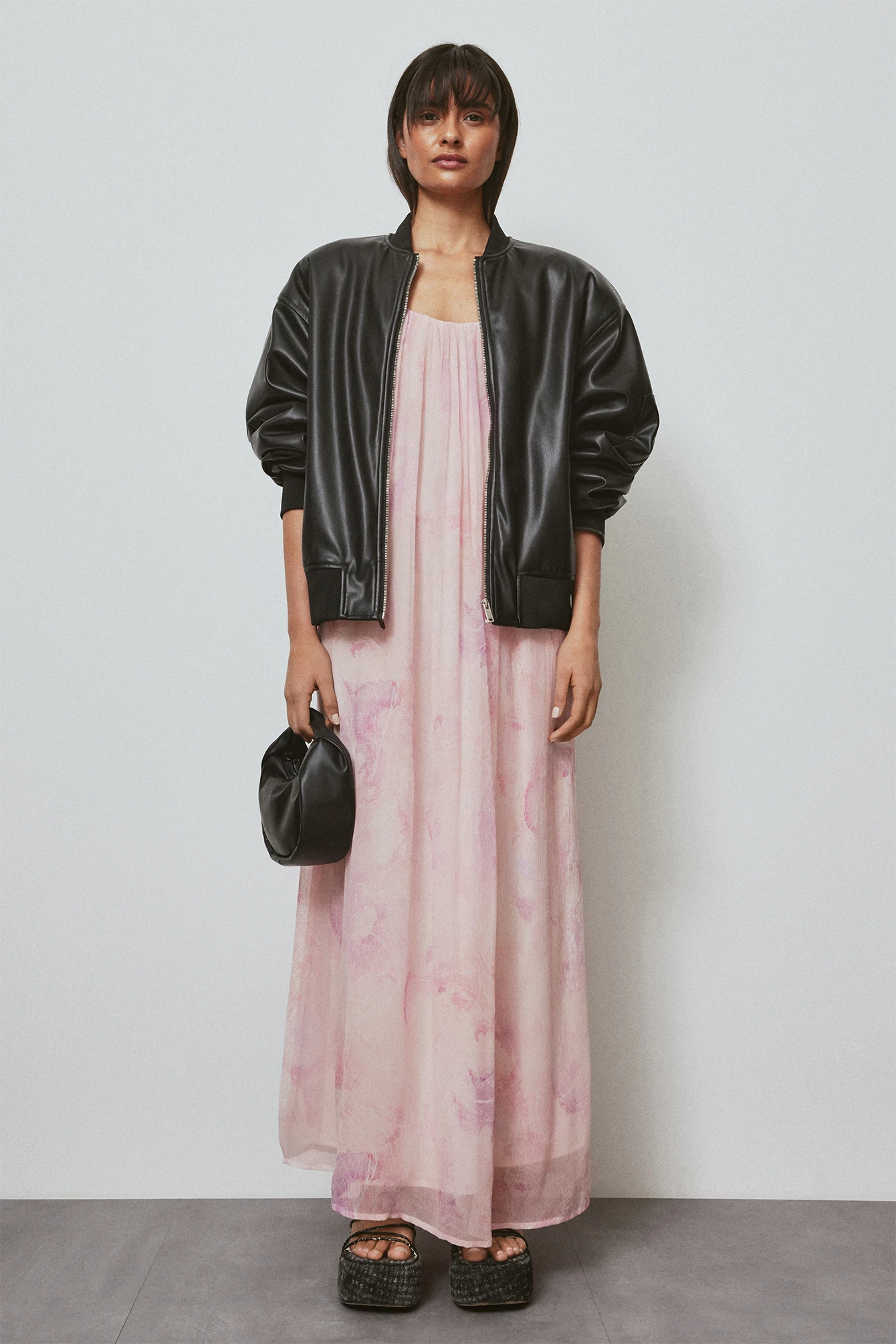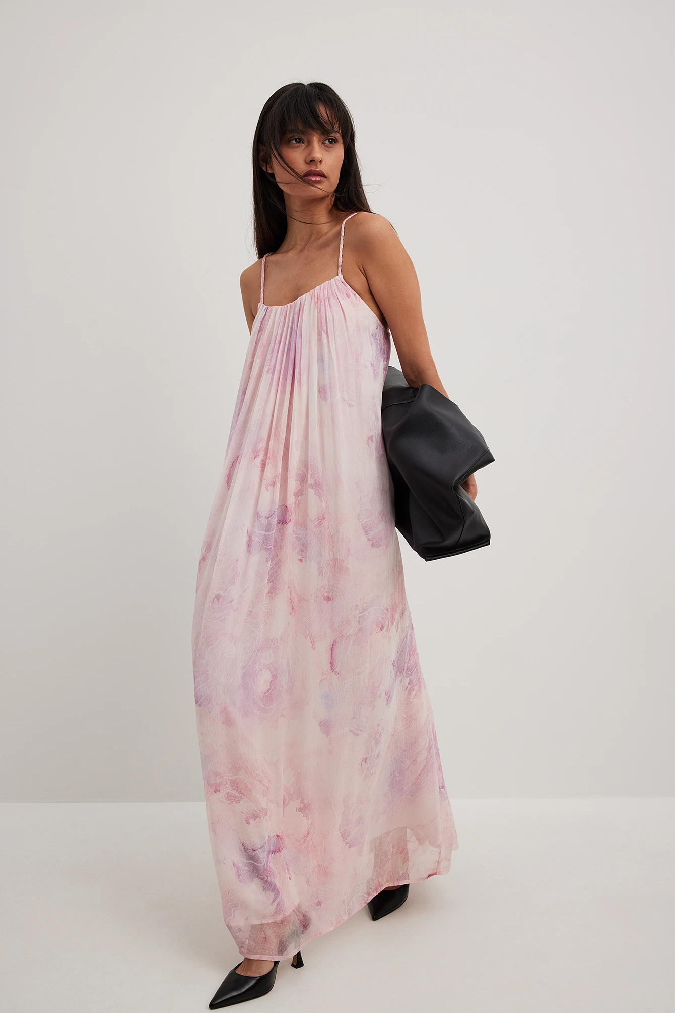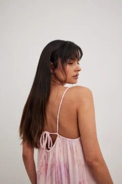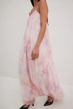 Cette robe a une coupe fluide et du soie chair. Elle a un col en V et des bretelles tressées et réglables. Cette robe a une taille longue.