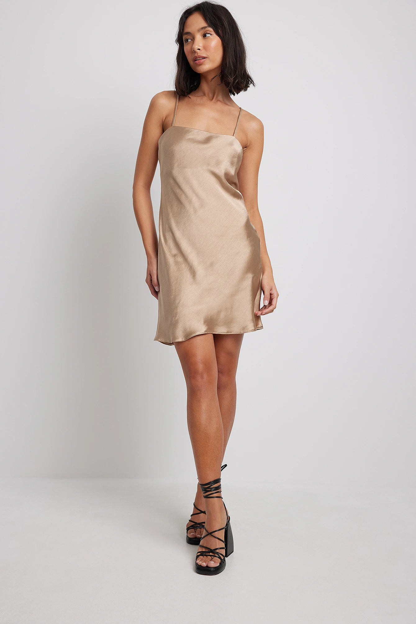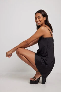 Cette robe courte a des bretelles ajustables, une coupe trapèze et une coupe fluide.