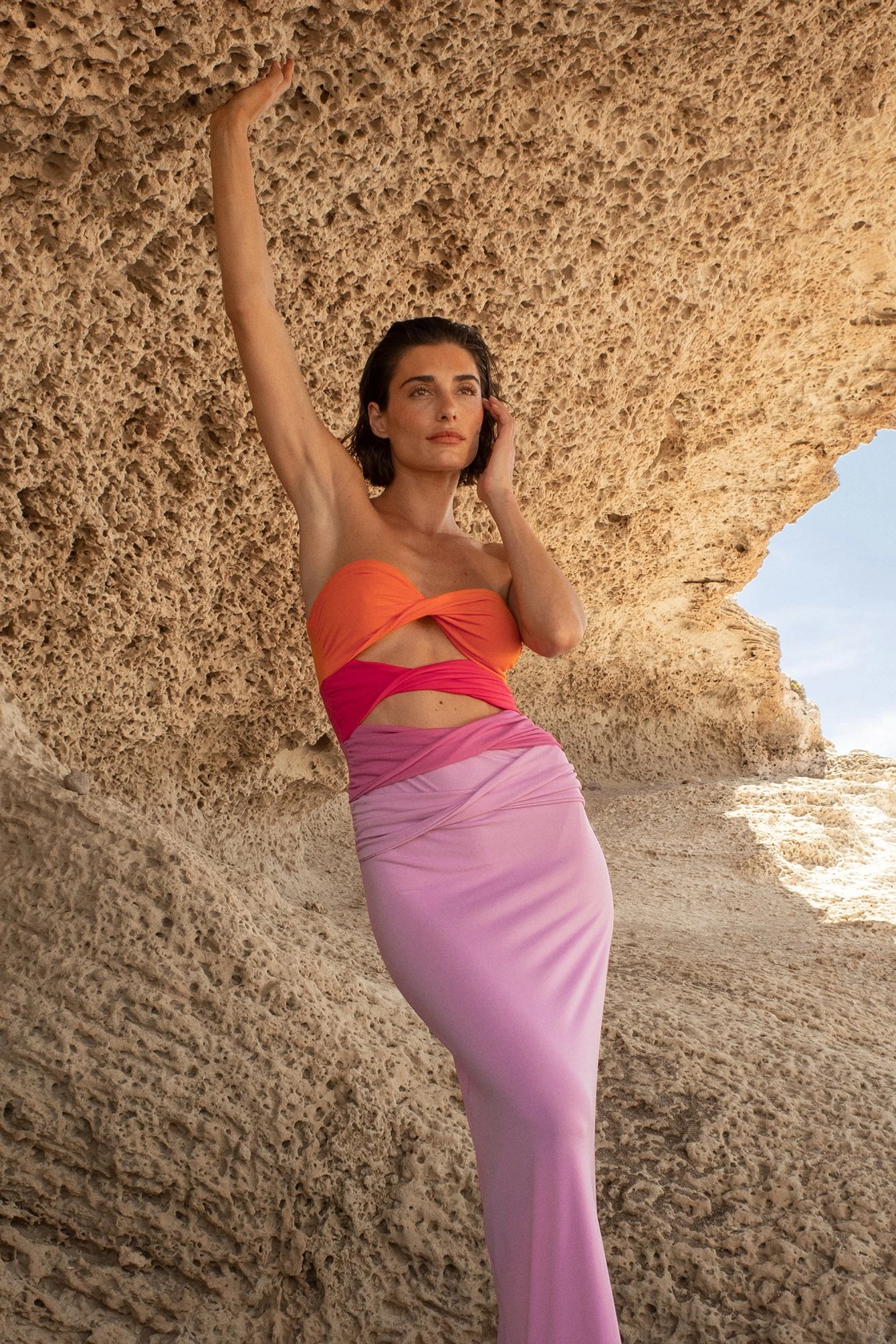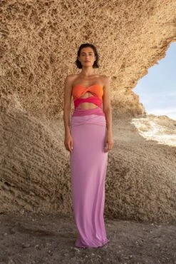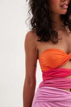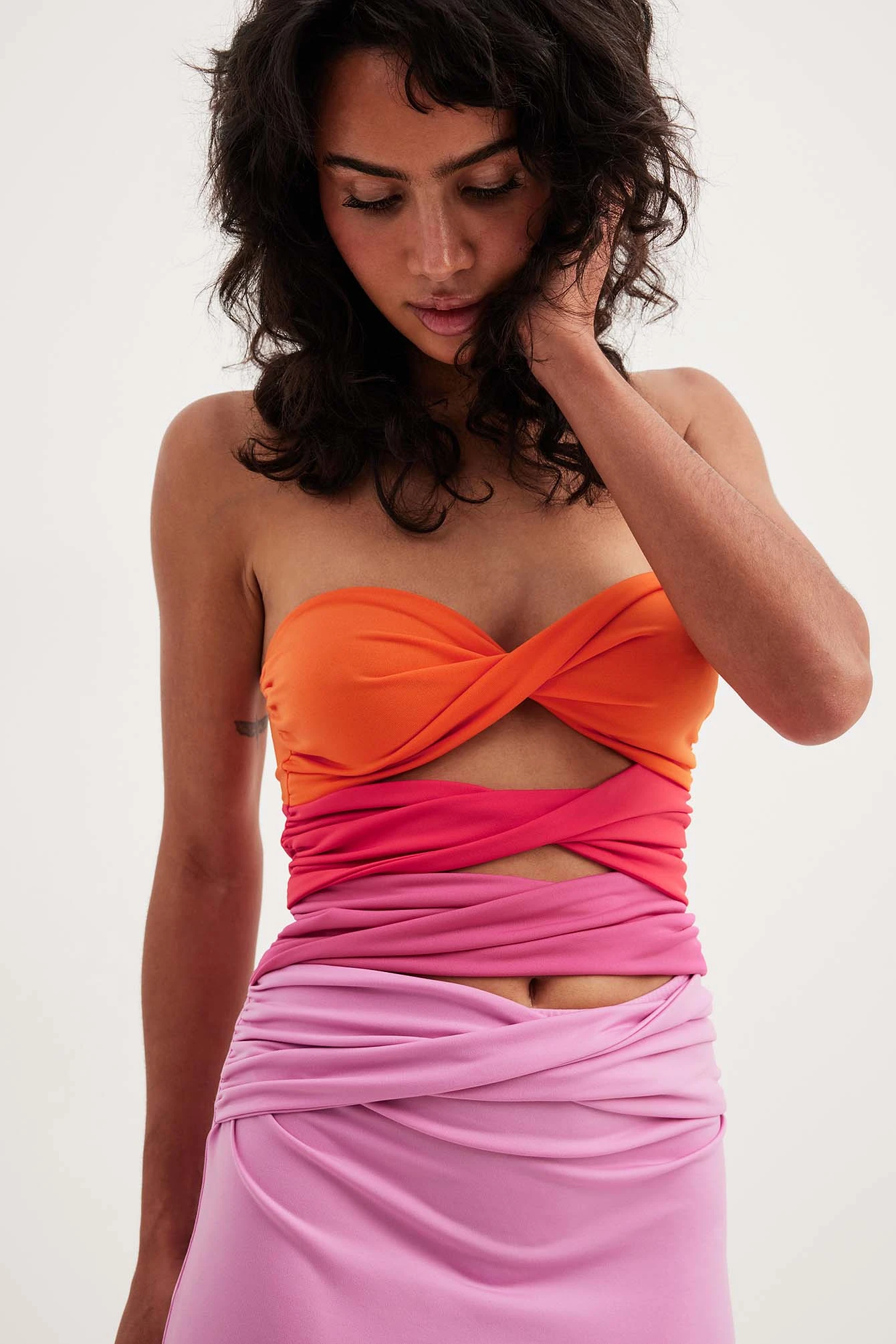 Cette robe longue a un design à bandeau. Elle a des détails de torsion et des détails découpés à l’avant. Cette robe longue a des coutures latérales ruchées et une matière élastique.