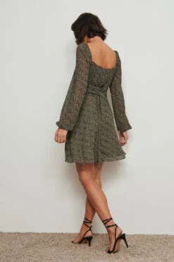 Cette robe courte a un détail froncé sur la poitrine, des manches longues bouffantes, une fermeture éclair latérale et un noeud à nouer à l’arrière.