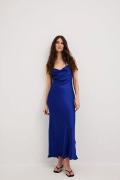 Cette robe longue a un toucher satin. Elle a une coupe fluide et un design sans manches avec bretelles ajustables. Cette robe longue a un col bénitier, un détail découpé à l’arrière et un crochet et oeillet de fermeture à l’arrière.