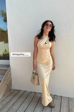 Cette robe longue a un modèle de bretelle à nouer dans le cou avec détail de torsion et une matière en jersey doux.