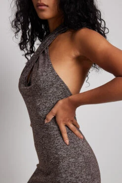 Cette robe longue a un modèle de bretelle à nouer dans le cou avec détail de torsion et une matière en jersey doux.
