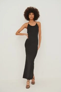 Cette robe longue a un col arrondi, des bretelles fines, un dos ouvert avec détail de lacet et une longue fente à l’arrière.
