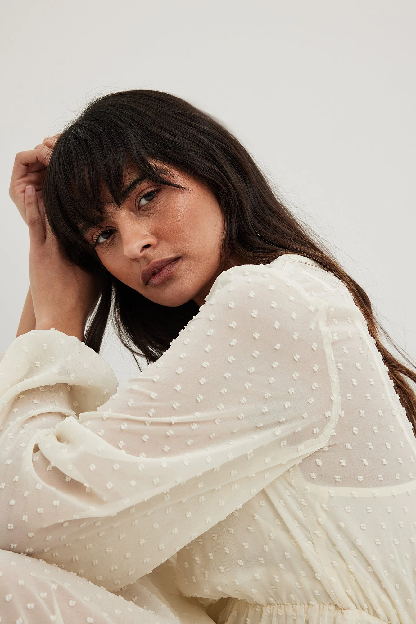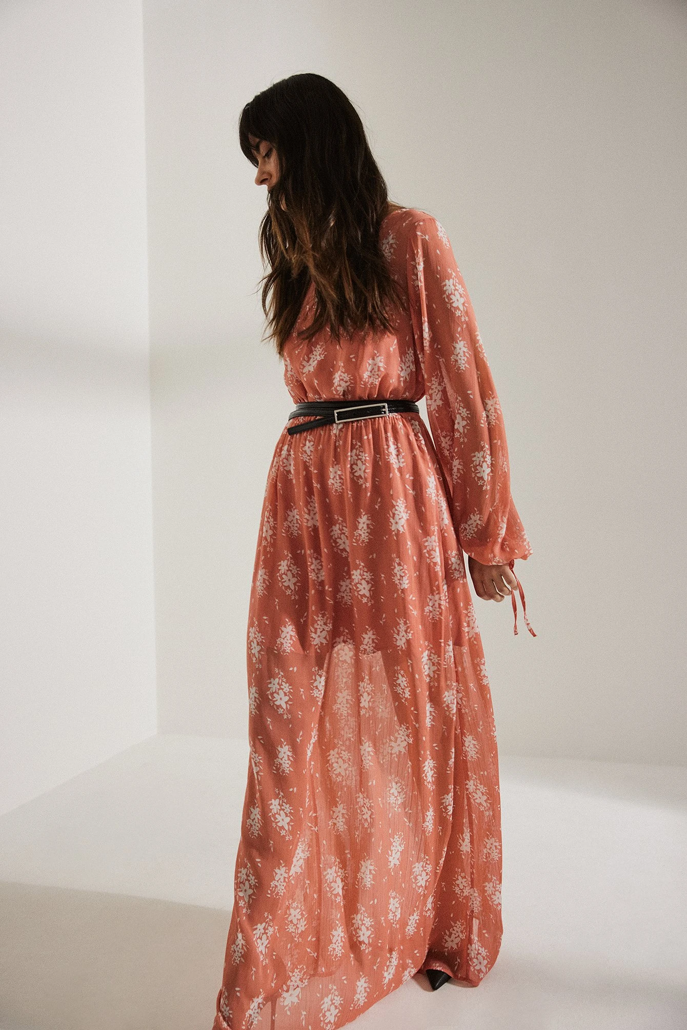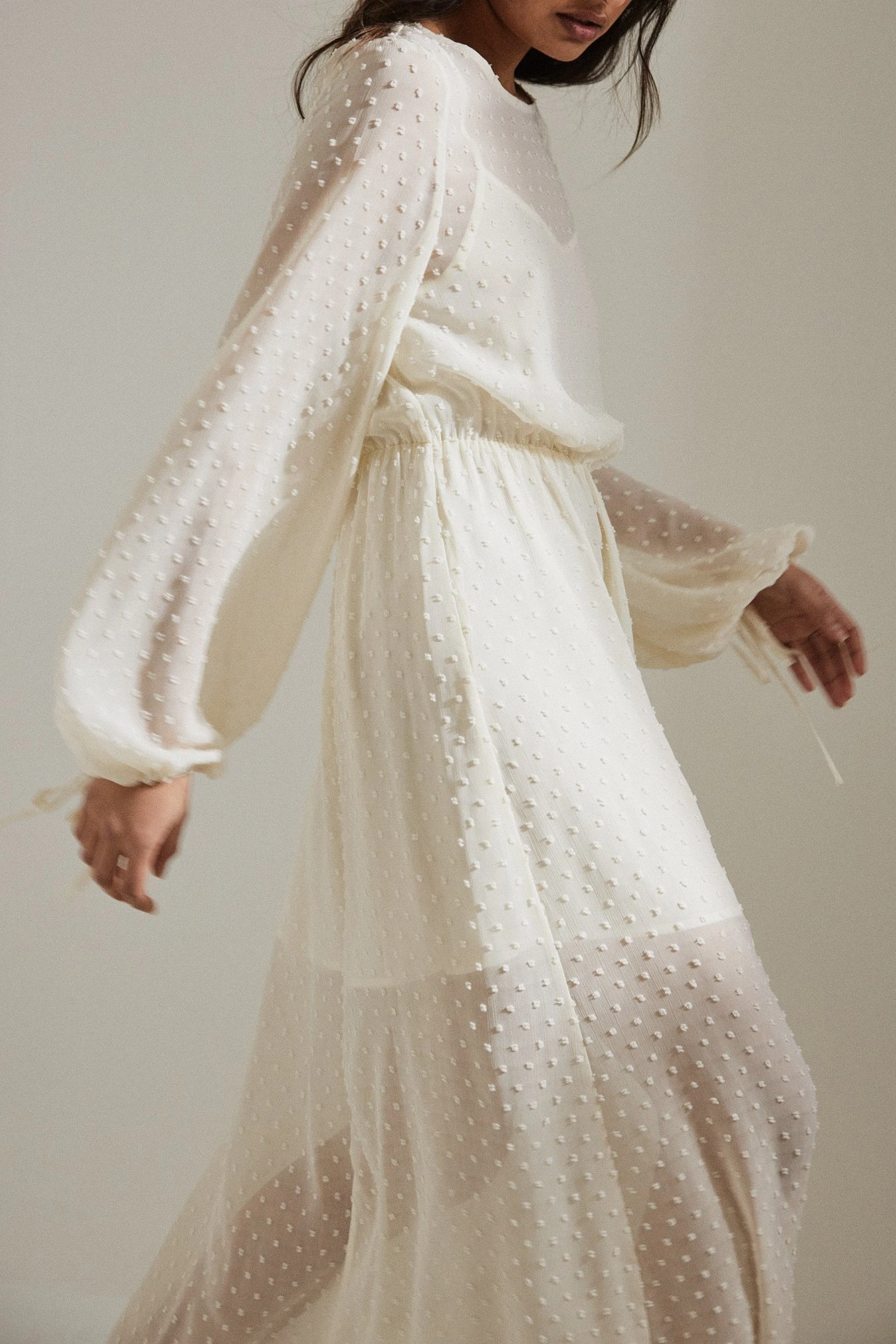 Cette robe longue a une coupe fluide. Elle a un bouton de fermeture Ă l’arrière de la nuque et des manches longues et volumineuses avec dĂ©tails Ă cordons coulissants. Cette robe longue a une ceinture Ă©lastique et une mi-longue doublure sur la moitiĂ© haute.