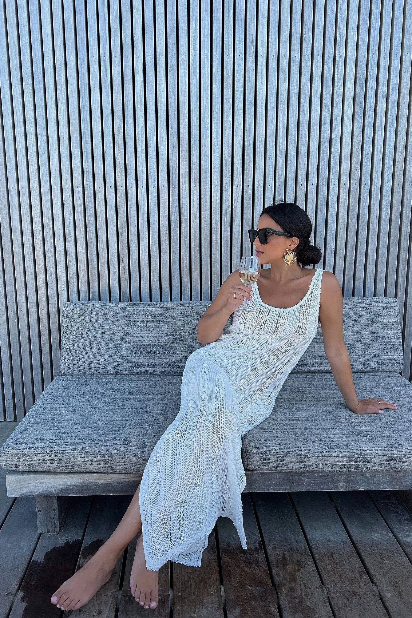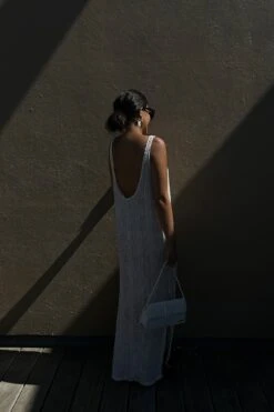 Cette robe longue a une matière extra-fine tricotée, une encolure profonde et des détails fendus au bas.
