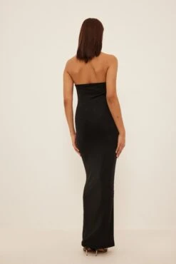 Cette robe a un col arrondi avec attache de tour de cou, un ajustement de forme et une taille longue.