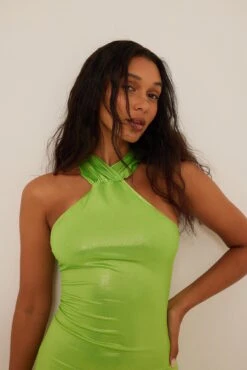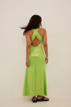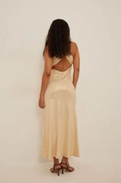 Cette robe a un col haut avec détail de torsion, un dos ouvert, une taille longue avec coupe fluide et une matière brillante.