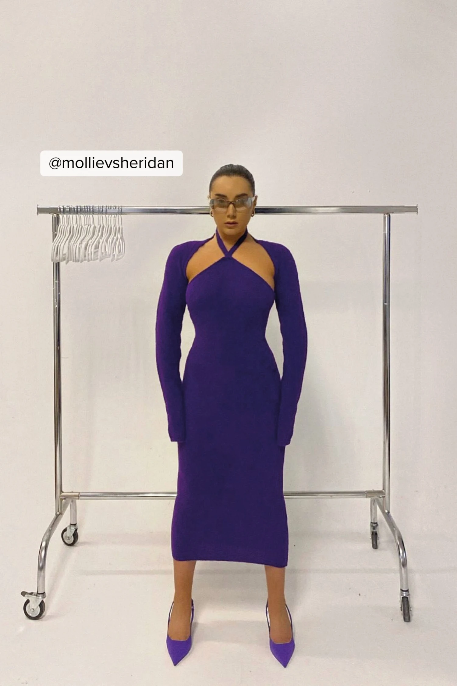 Cette robe longue a une bretelle tour du cou ajustable et une matière douce et tricotée.