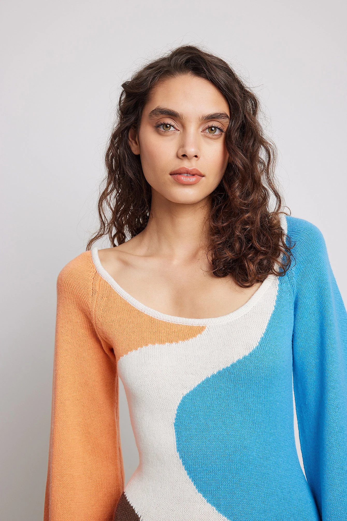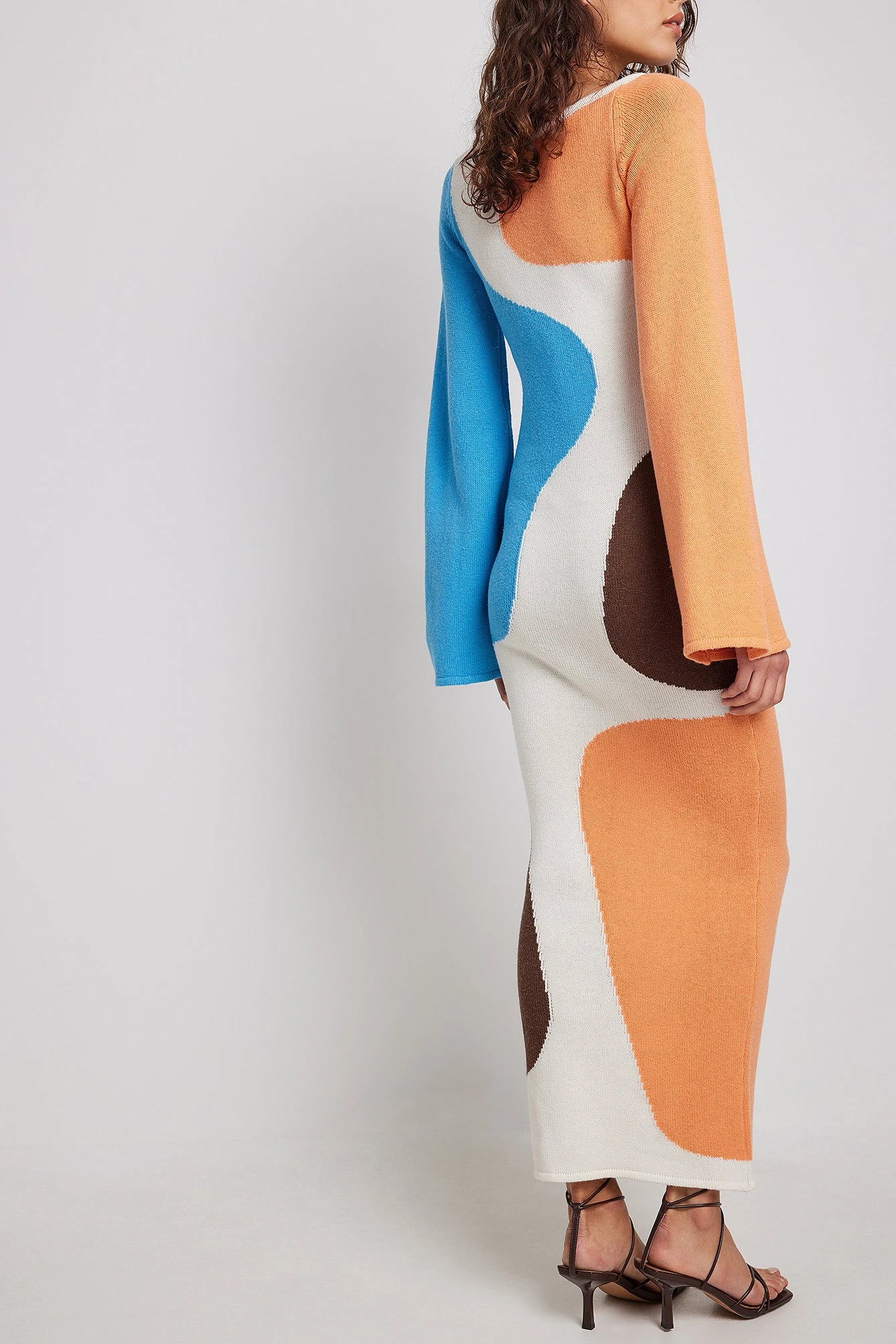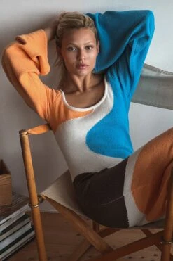 Cette robe longue est tricotée et jacquard et a une encolure légèrement plus large et une manche longue large.