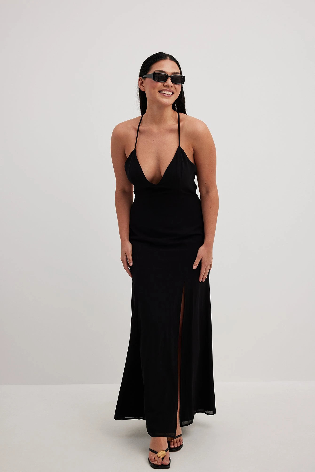 Cette robe longue a un col en V. Elle a des bretelles fines et un dos ouvert. Cette robe longue a un détail auto-sérré réglable à l’arrière, une fermeture éclair sur le côté et une longue fente à l’avant.