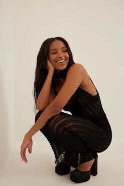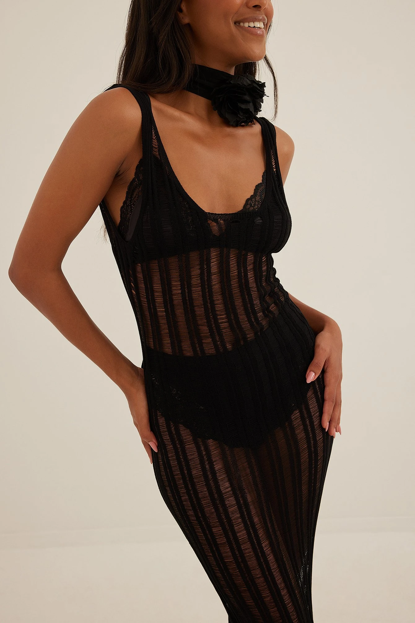 Cette robe longue a un col arrondi, des bretelles, un décolleté dos, une coupe moulante et un tissu tricoté transparent et délavé.