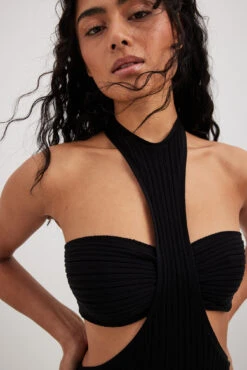 Cette robe longue est élastique et a une maille fine à nervures. Elle a un col haut avec bouton de fermeture à l’arrière de la nuque et un détail découpé.
