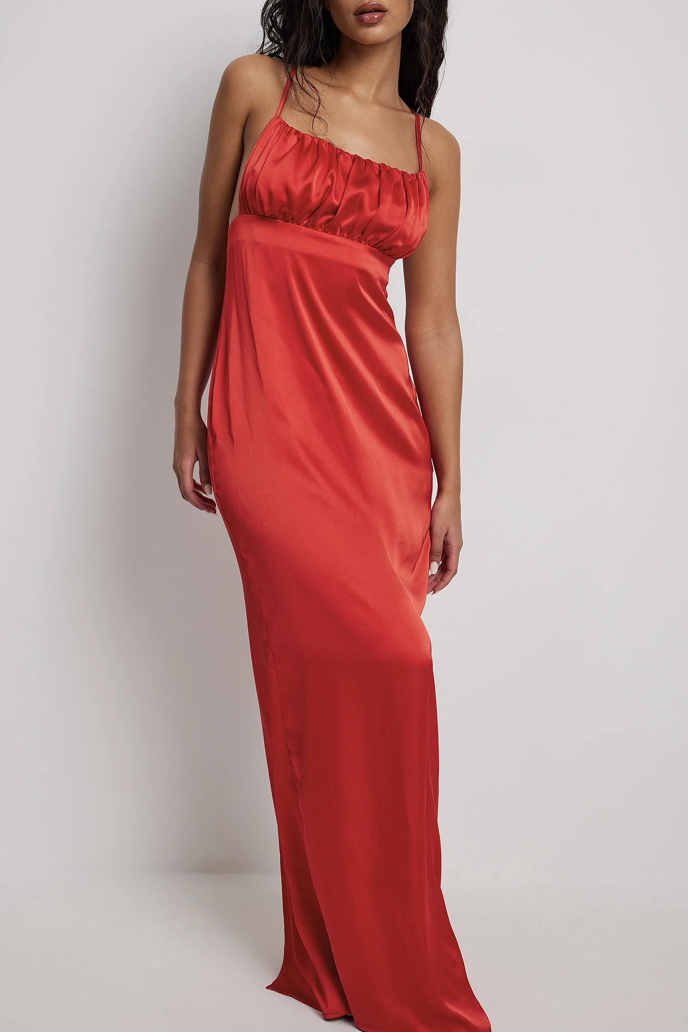 Cette robe longue est sans manches et faite en satin et a des bretelles réglables, un détail fendu arrière, un détail au niveau de la poitrine ruché et une fermeture éclair latérale.