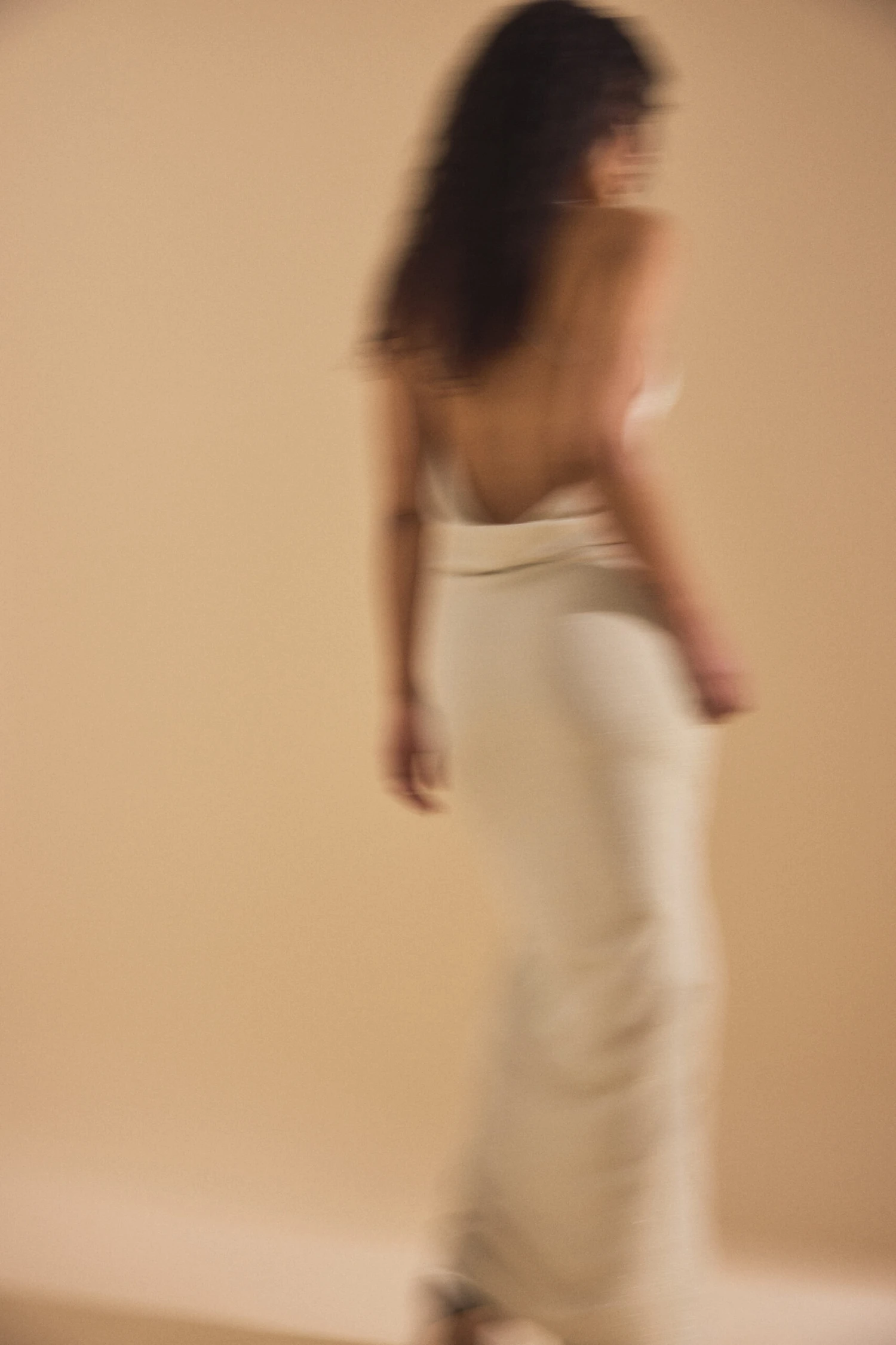 Cette robe longue est sans manches et a des bretelles avec bretelles croisées dans le dos. Elle a un col bénitier et une fente latérale.