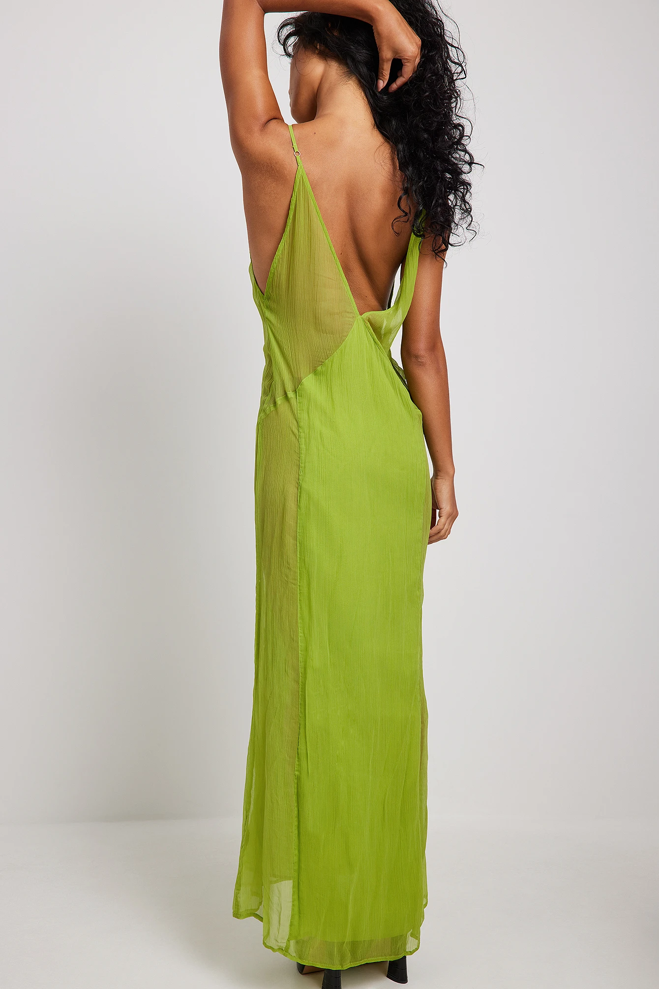 Cette robe longue est transparente et partiellement doublée et a des bretelles fines et non ajustables. Elle a un col en V et une fente latérale haute. Cette robe longue a un soutien-gorge non rembourré et amovible avec bretelles réglables.