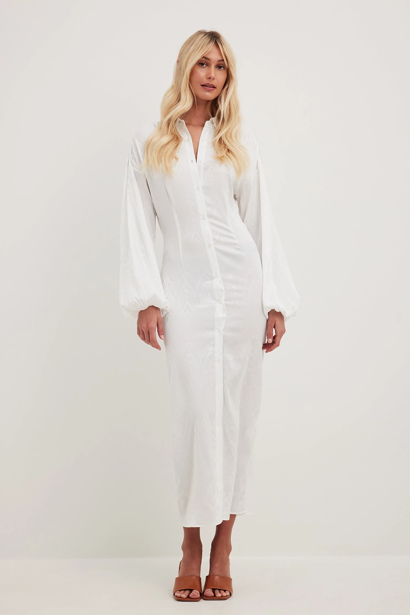Cette robe midi est jacquard et a une col de chemise. Elle a une manche longue bouffante avec manchettes élastiques et un bouton de fermeture.