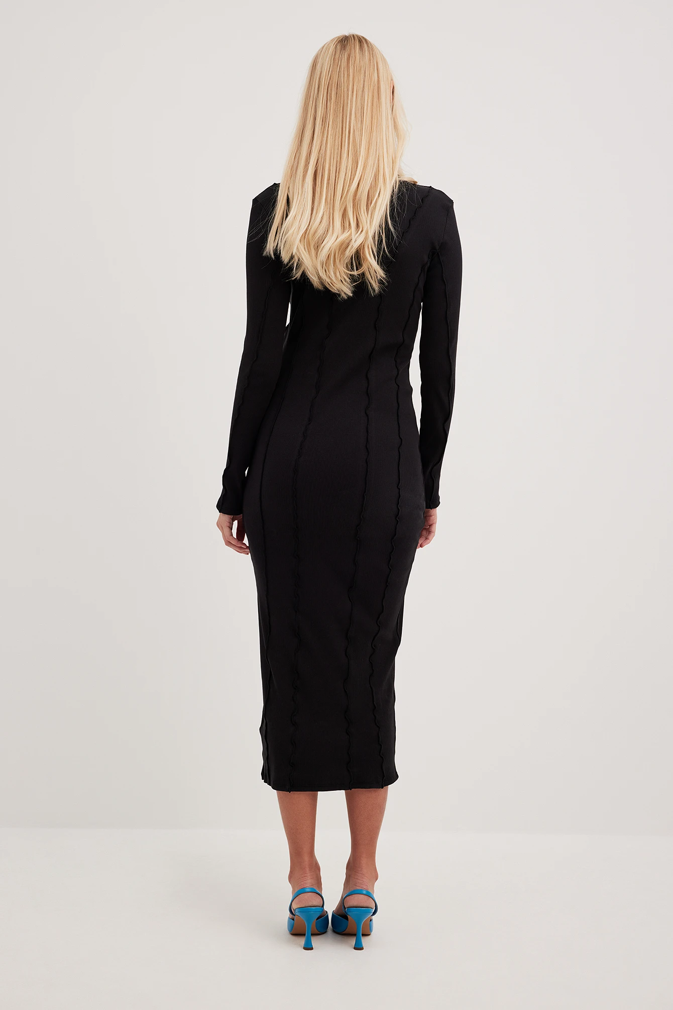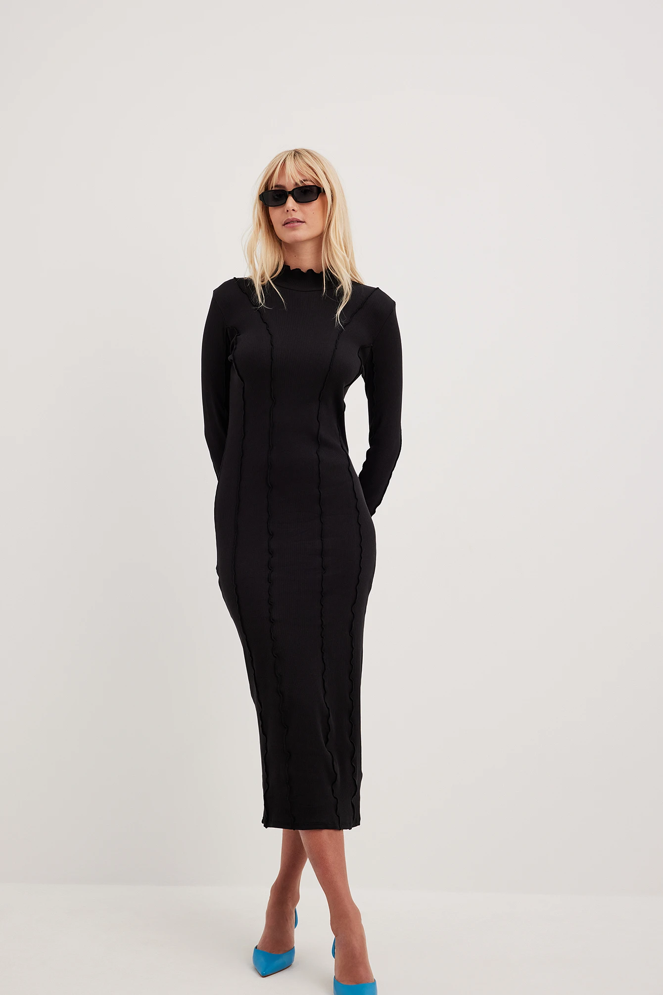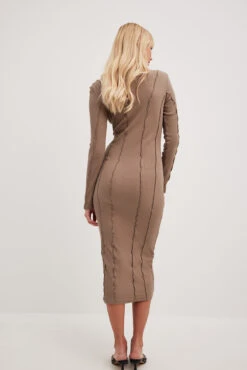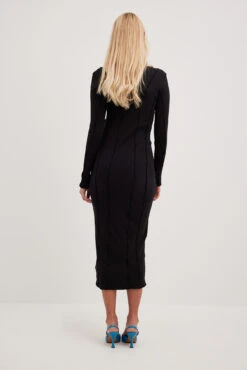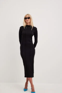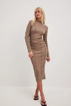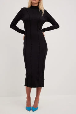 Cette robe est ajustée et a une matière élastique à nervures. Elle a des détails de couture avec design babylock, un col haut avec bord babylock et une taille midi.
