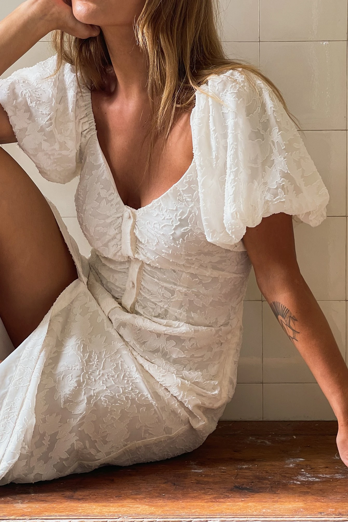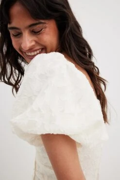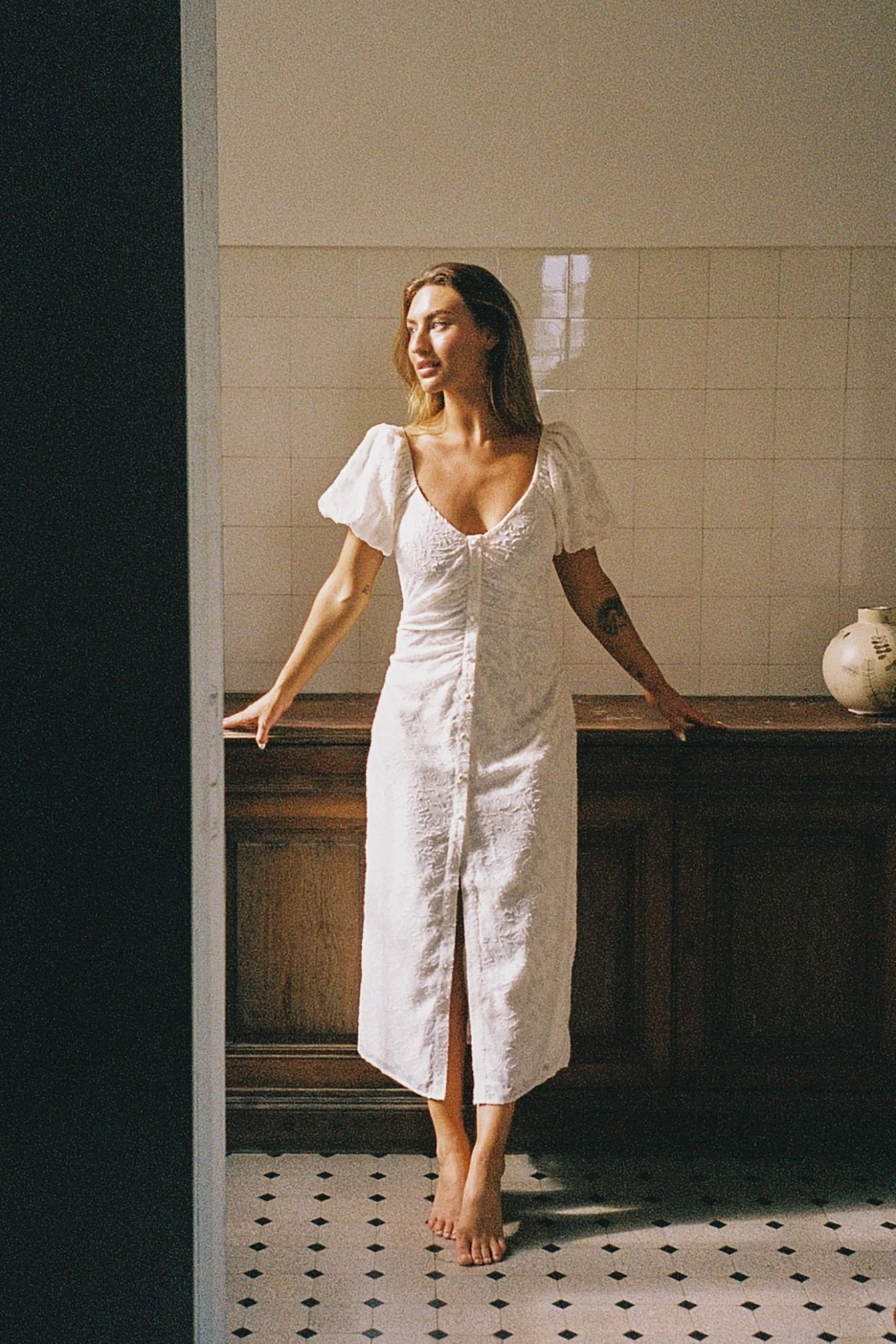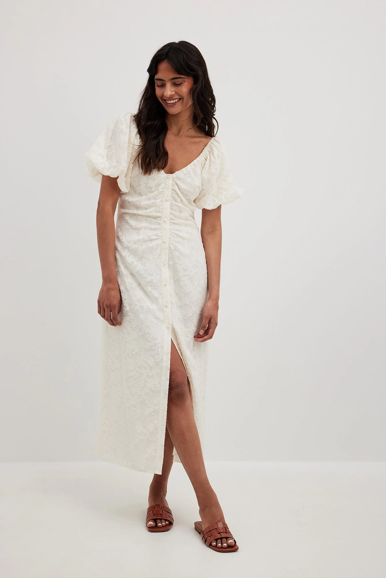 Cette robe midi a une matière texturée. Elle a un col en V et des manches bouffantes. Cette robe midi a des boutons de fermeture à l’avant, une doublure intégrale, une fente frontale et un détail froncé à l’arrière.