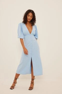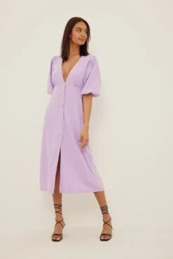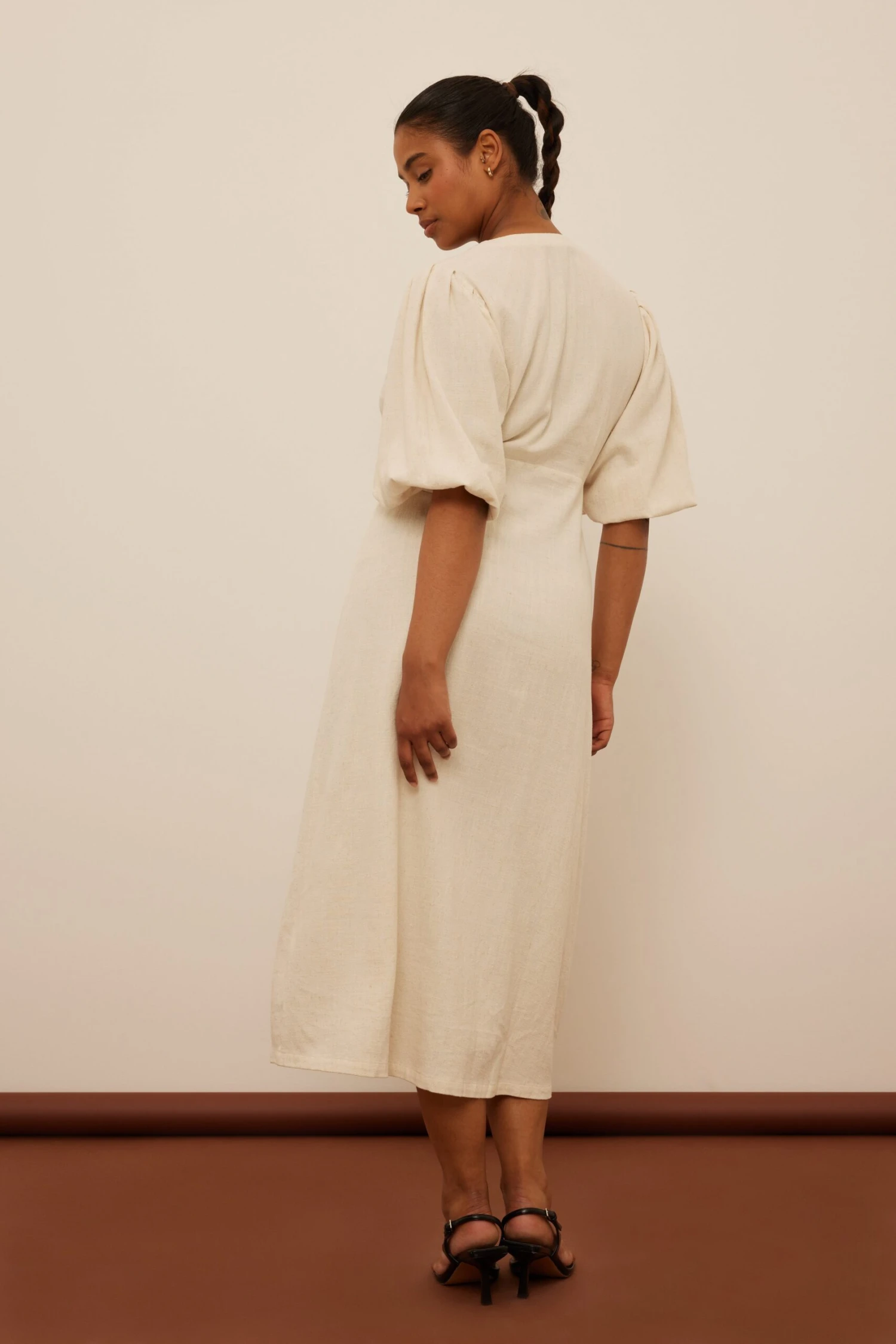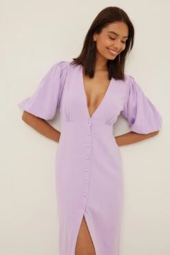 Cette robe a un col en V, des manches trois quarts avec manchettes serrĂ©es, un bouton de fermeture Ă l’avant, une taille midi, une coupe fluide et une matière en lin lĂ©ger.