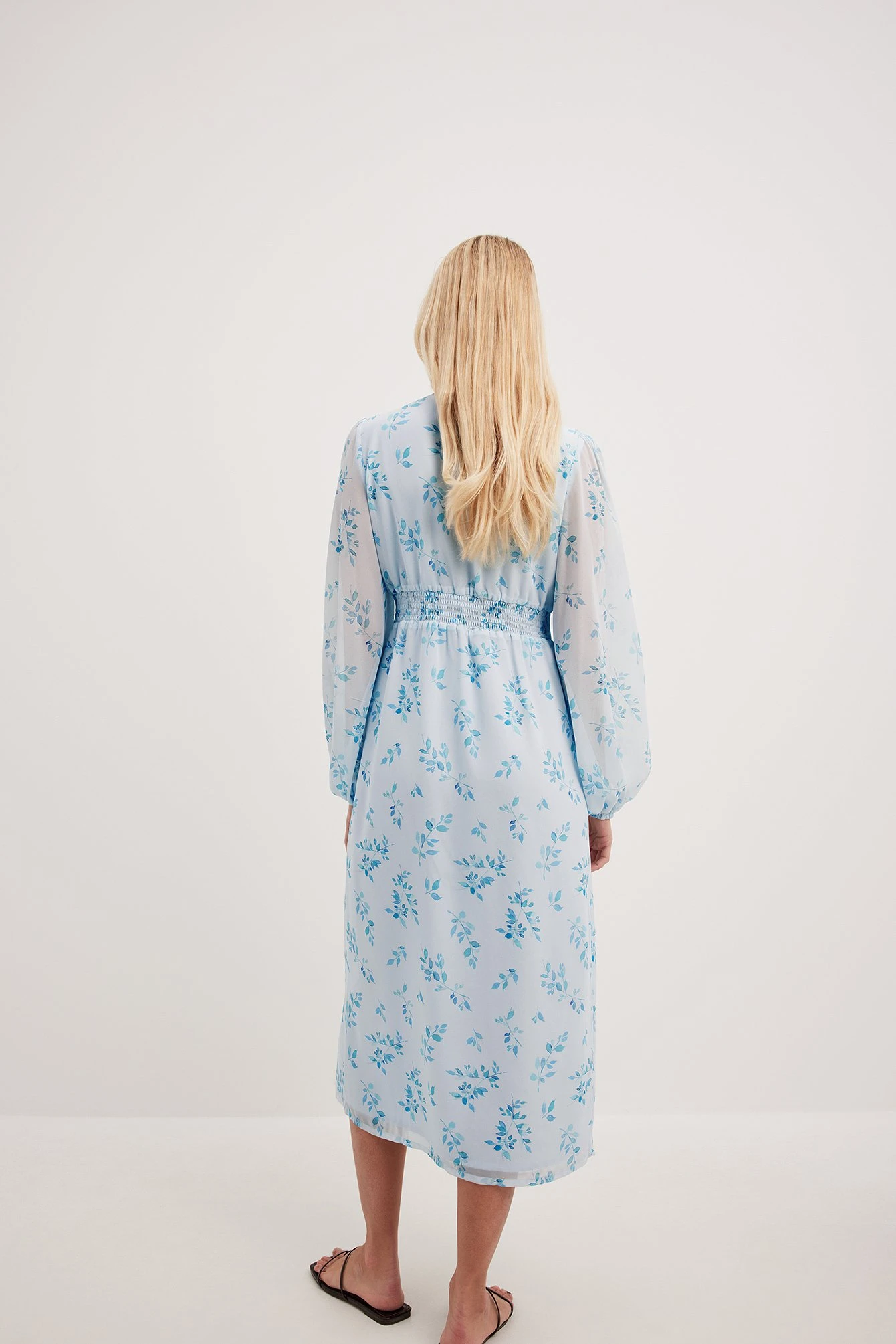 Cette robe midi a un col en V. Elle a un bouton Ă l’avant et des smocks Ă©lastiques Ă la taille. Cette robe midi a une fermeture Ă©clair sur le cĂ´tĂ©, des manches ballon longues et bouffantes, une manchette Ă©lastique, une fente Ă l’avant et une doublure.
