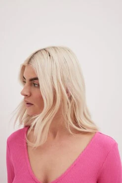 Cette robe midi est faite en jersey nervuré et a une matière élastique. Elle a une coupe moulante et un col en V. Cette robe midi a des manches longues.