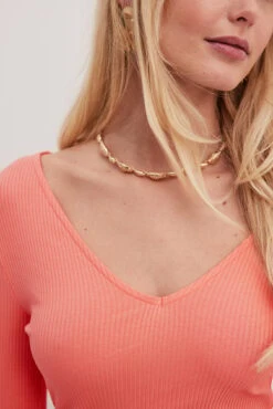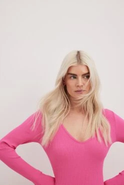 Cette robe midi est faite en jersey nervuré et a une matière élastique. Elle a une coupe moulante et un col en V. Cette robe midi a des manches longues.