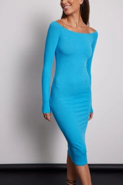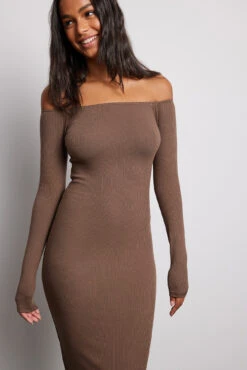 Cette robe midi est à nervures et a un design à épaules dénudées avec élastique. Elle a des manches longues et de la forme serrée.