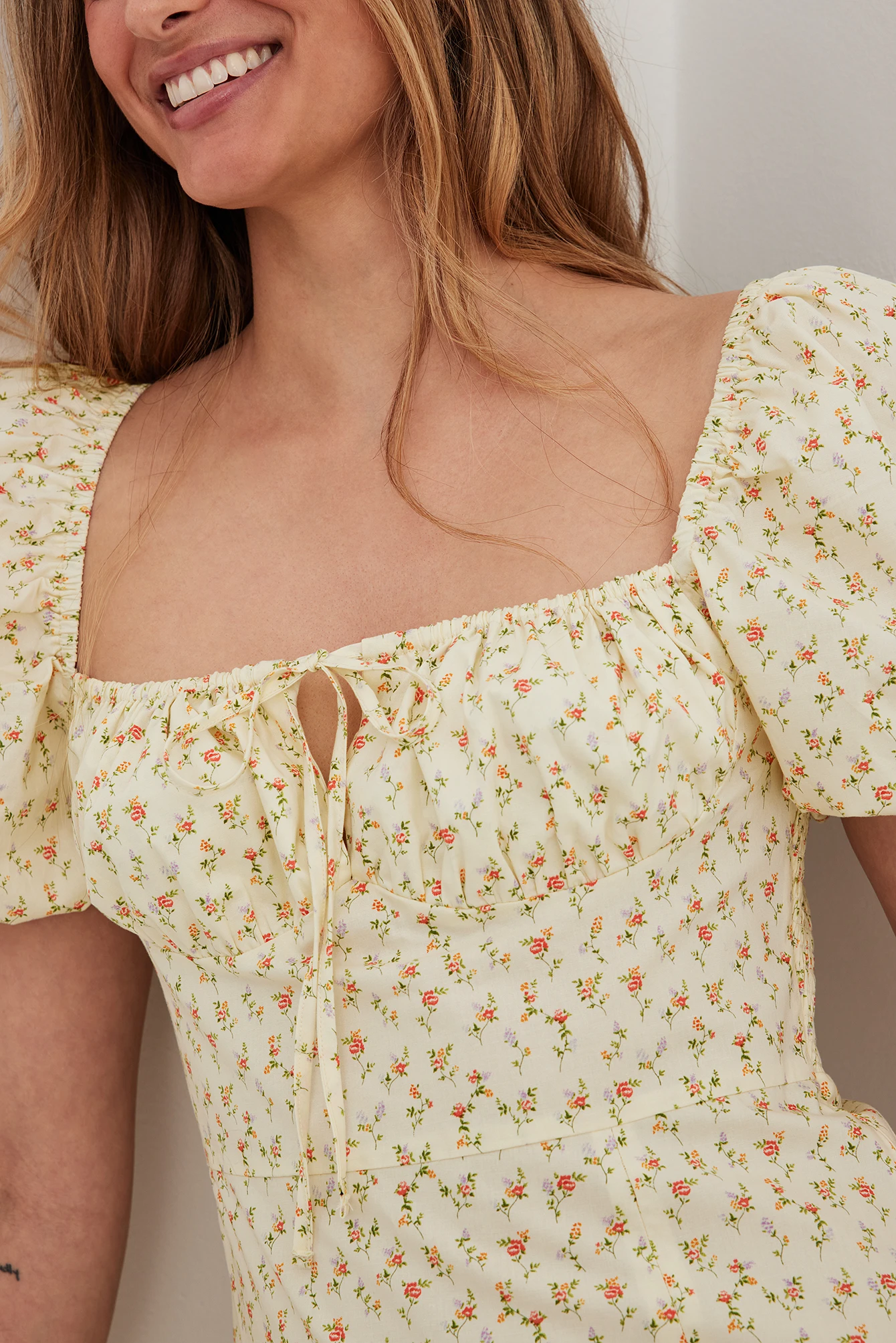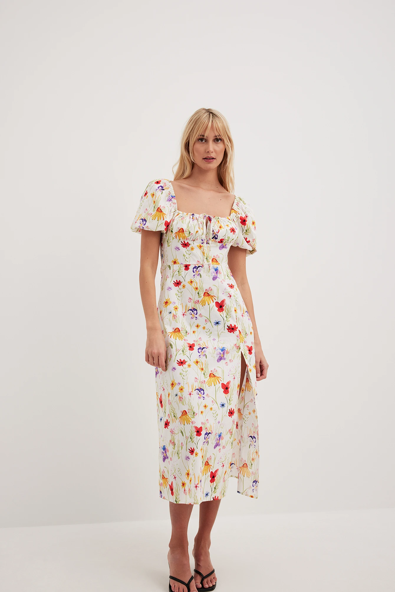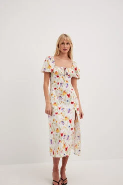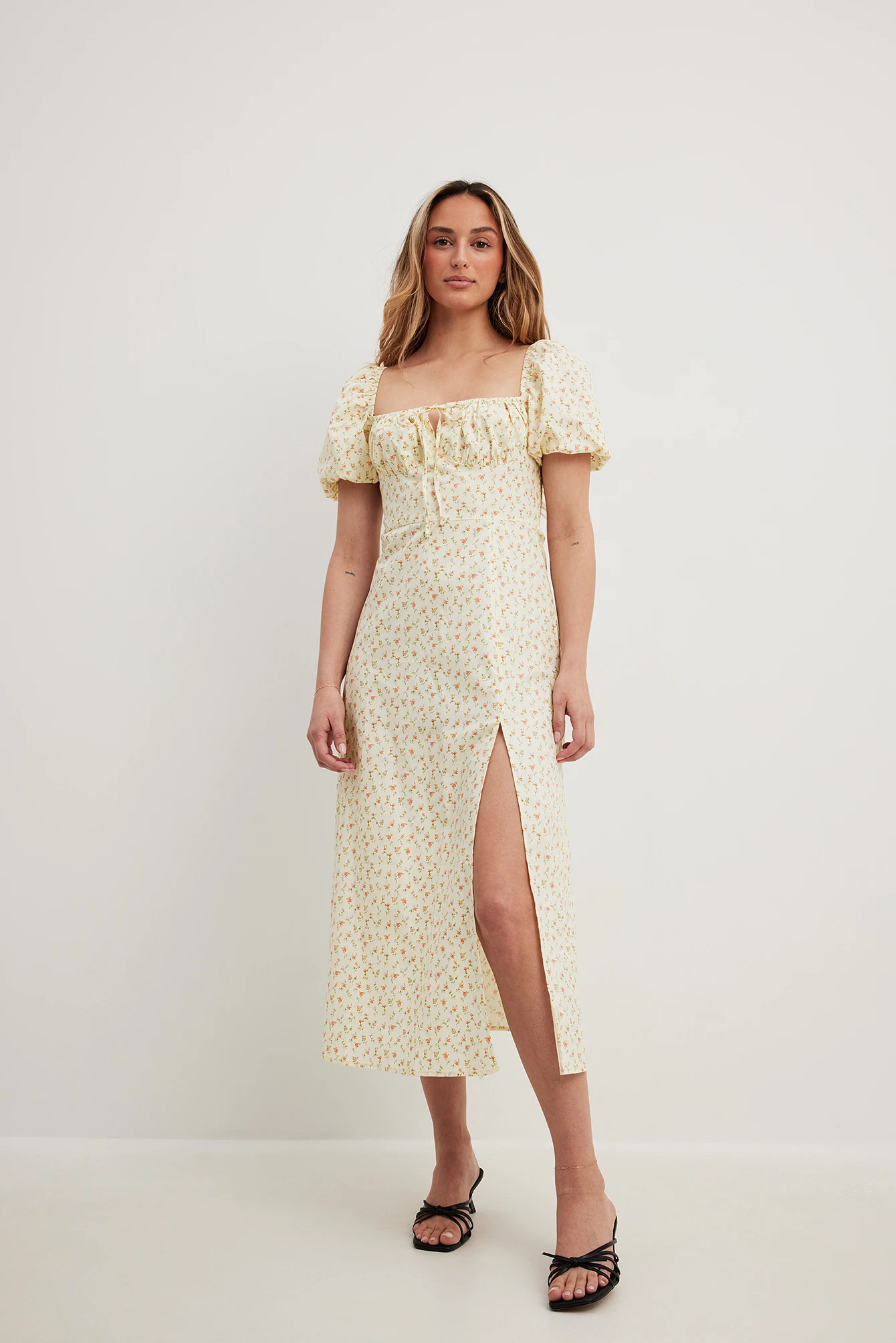 Cette robe midi a un col carré élastique avec noeud à nouer. Elle a des manches courtes bouffantes et des détails de bonnet sur la poitrine. Cette robe midi a un détail fendu.
