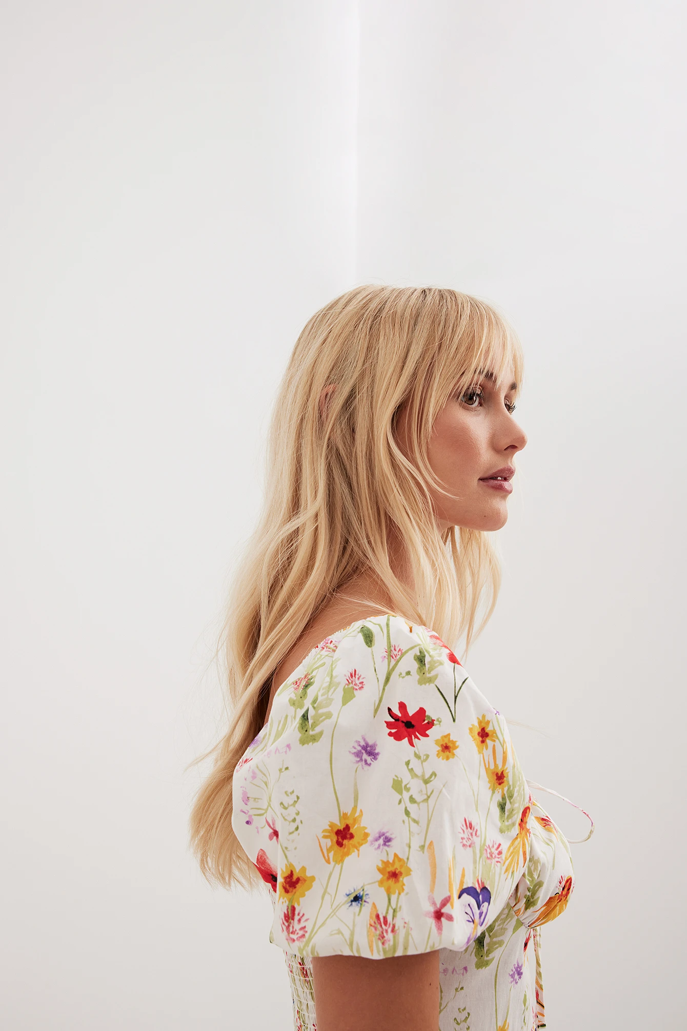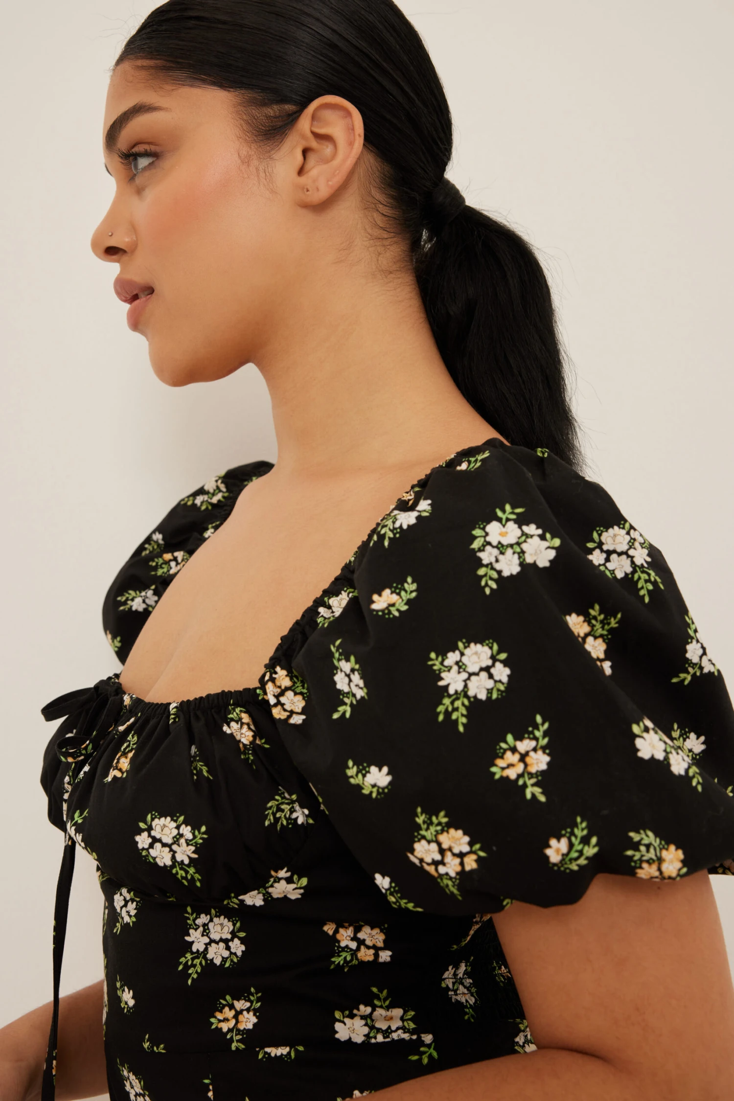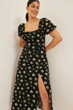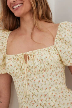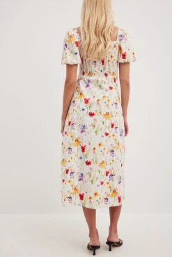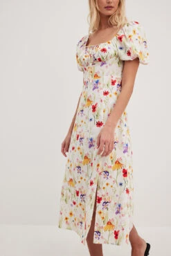 Cette robe midi a un col carré élastique avec noeud à nouer. Elle a des manches courtes bouffantes et des détails de bonnet sur la poitrine. Cette robe midi a un détail fendu.