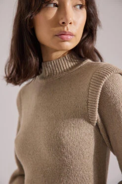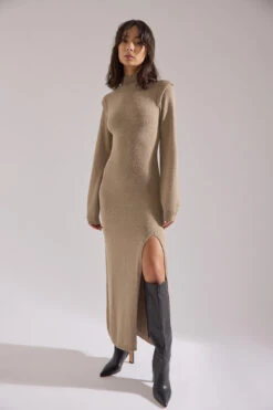 Cette robe longue est tricotée et élastique et a un col haut. Elle a des détail d’épaules et des manches longues. Cette robe longue a une fente latérale.