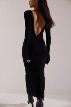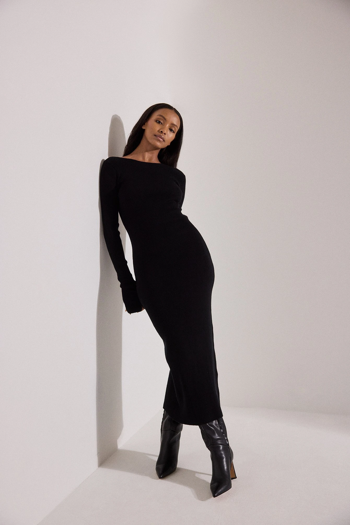 Cette robe midi est tricotée et a un décolleté bateau. Elle a un design à dos ouvert.