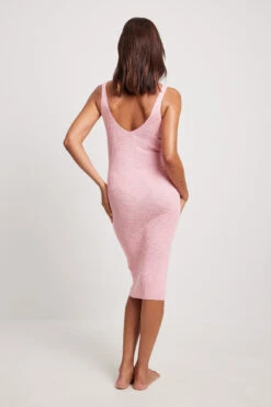 Cette robe midi a un col en V avec détails de couture, un dos ouvert et une matière tricotée à nervures.