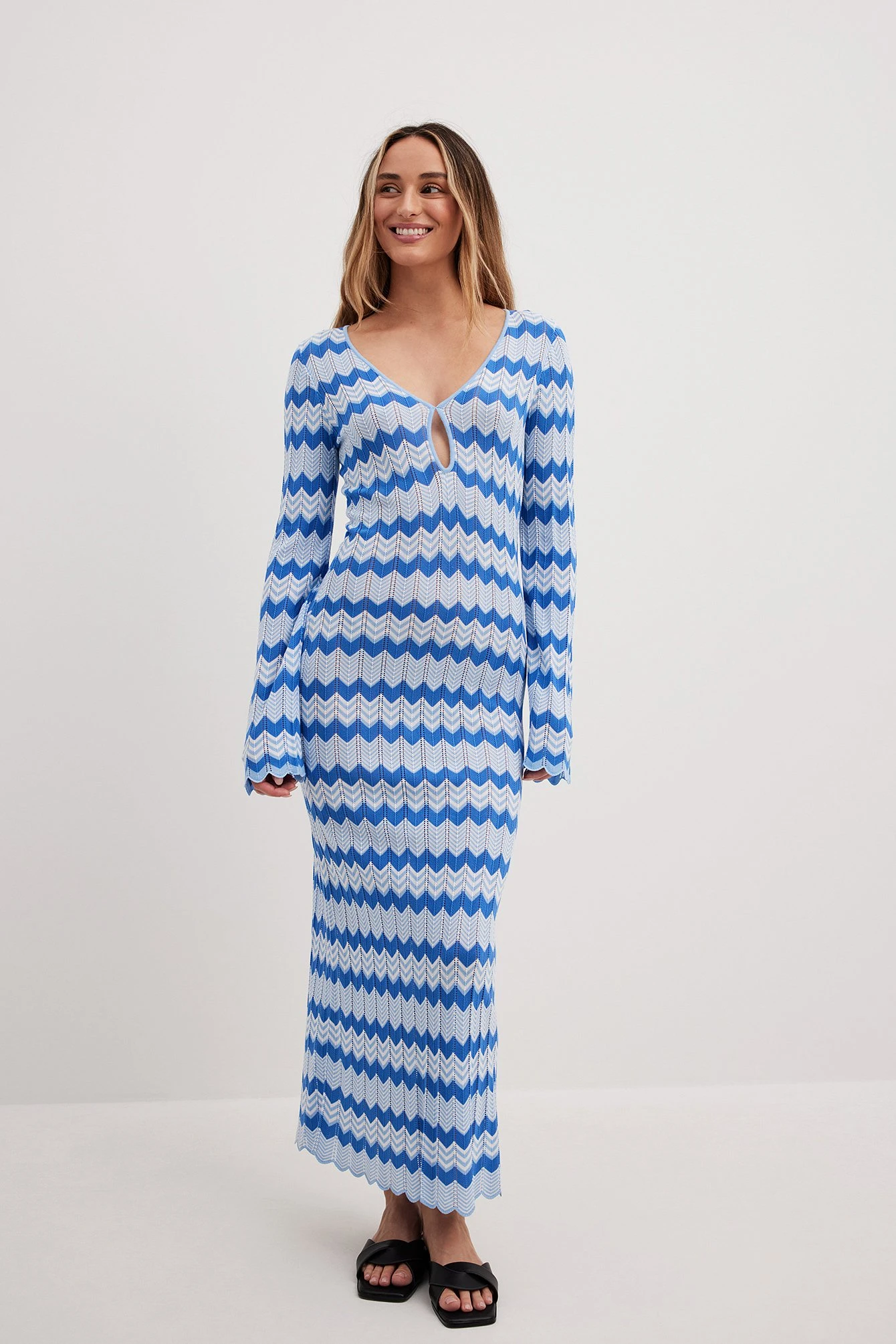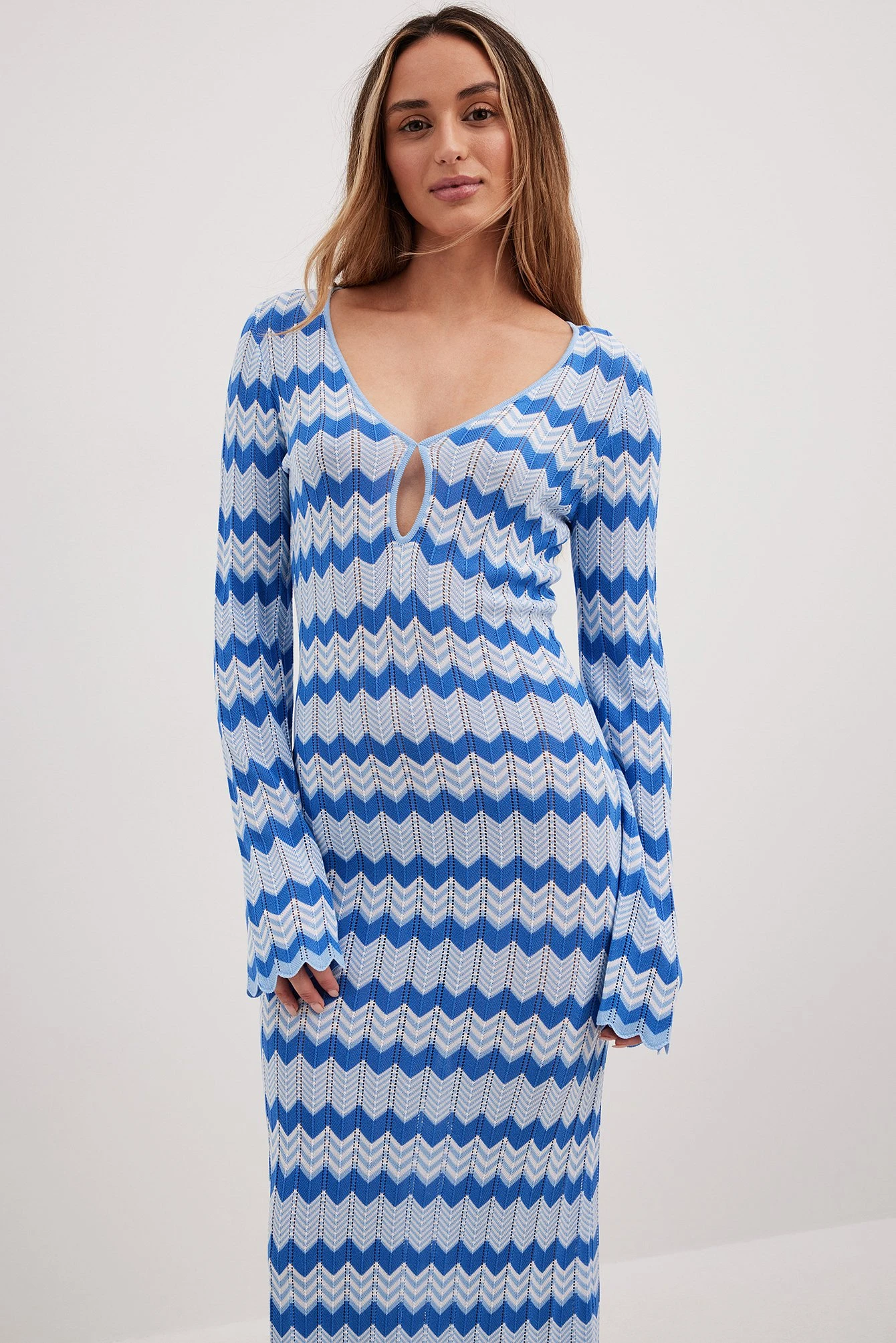Cette robe a un design tricoté. Elle a une taille midi et une coupe moulante. Cette robe a un col en V, un détail découpé sur la poitrine et des manches longues.