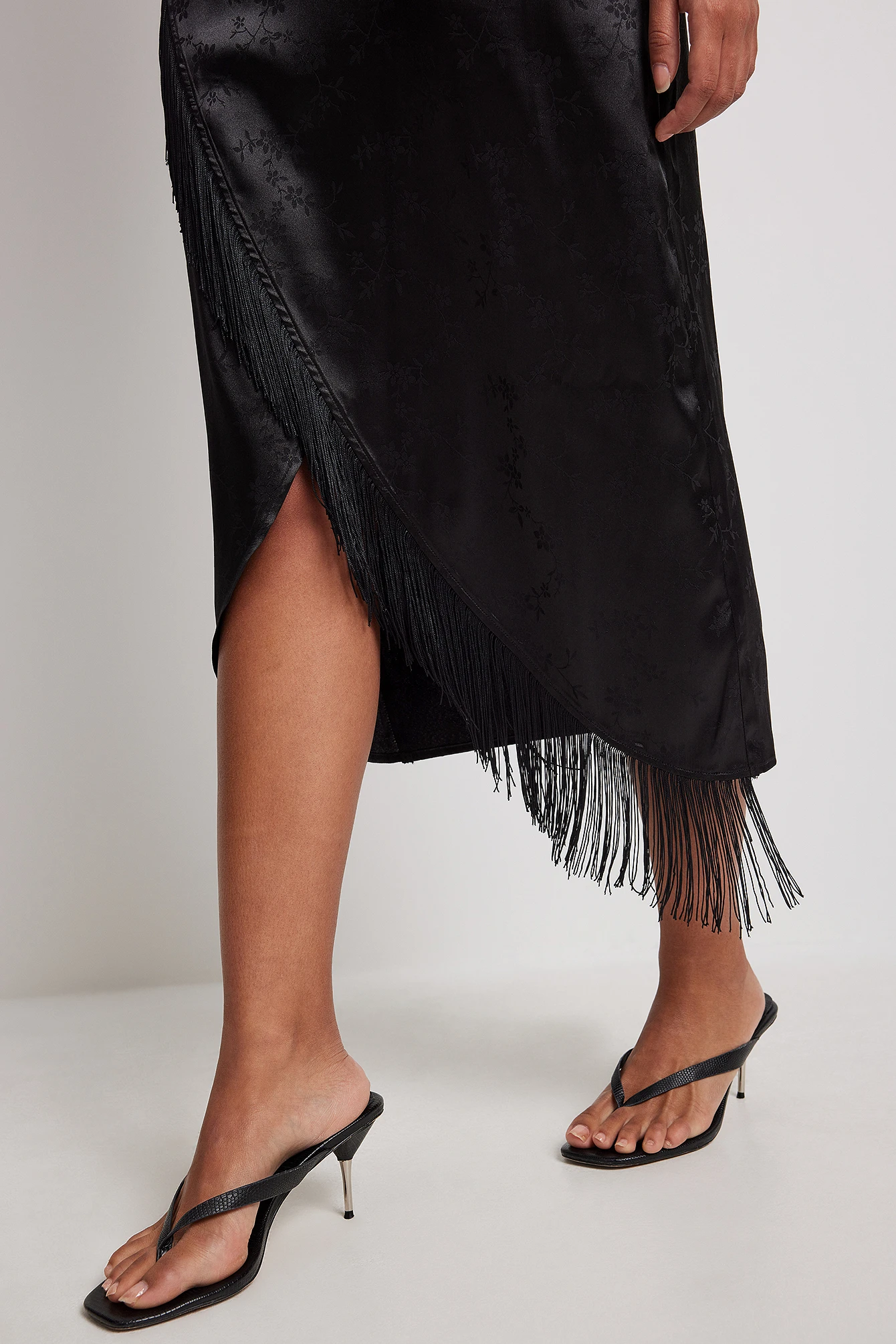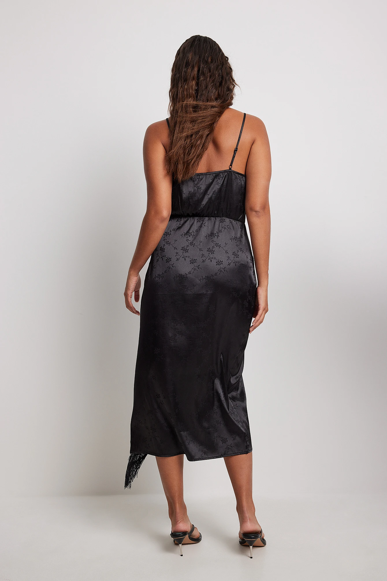 Cette robe a des bretelles fines et rĂ©glables, un design chevauchant sur la poitrine et au bas avec dĂ©tail franges Ă l’avant, une fermeture Ă©clair latĂ©rale et du satin jacquard.