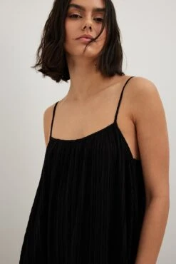Cette robe midi a une coupe fluide. Elle a un col arrondi et des bretelles réglables et fines. Cette robe midi a des détails froissés au bas.