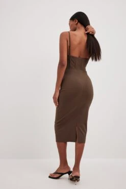 Cette robe midi est Ă©lastique et a des bretelles rĂ©glables, un dĂ©tail corset avec armature, une fermeture Ă©clair latĂ©rale cachĂ©e et un dĂ©tail fendu Ă l’arrière.